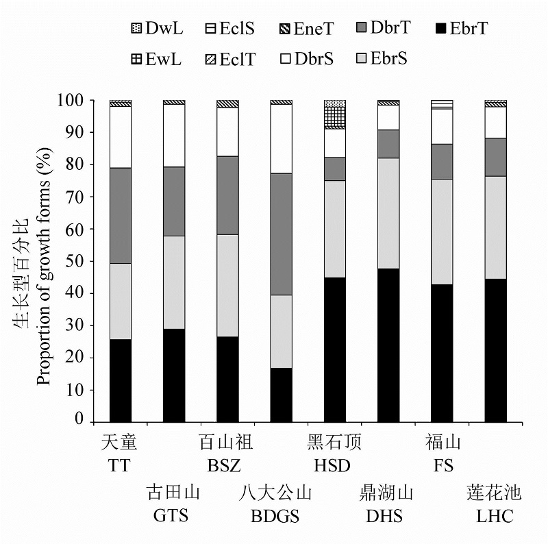 | 生长型Growth form | 天童 TT | 古田山 GTS | 百山祖 BSZ | 八大公山 BDGS | 黑石顶 HSD | 鼎湖山 DHS | 福山 FS | 莲花池 LHC | ||||||||