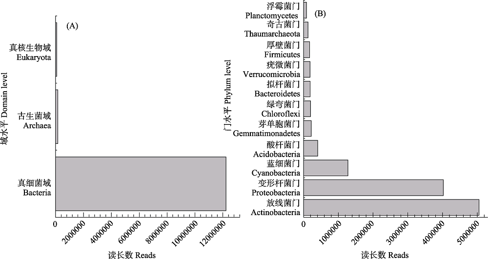 本研究对腾格里沙漠东南缘沙坡头地区藓结皮土壤样品进行了宏基因组测序, 以揭示该地区藓结皮土壤中参与固碳、固氮等生态功能的微生物基因及其代谢通路。结果表明, 藓结皮土壤中细菌域微生物最多, 其次为古生菌域和真核生物域。在细菌域中, 放线菌门(Actinobacteria)数量最多, 其次是变形菌门(Proteobacteria)和蓝细菌门(Cyanobacteria)。基于eggNOG和KEGG数据库对构建的非冗余基因集进行功能预测, 藓结皮土壤中微生物基因多样性和代谢路径多样性高。藓结皮土壤中与固氮相关的代谢通路丰度低可能是藓结皮固氮量微弱的根本原因, 造成利用大气中氮气合成氨的生态功能减弱。而藓结皮已经形成的氮库主要通过硝酸盐还原途径将硝酸盐还原成铵盐, 可能用于藓结皮微生物组自身的氨基酸合成, 也可能为藓类植物的生长提供有效氮源。