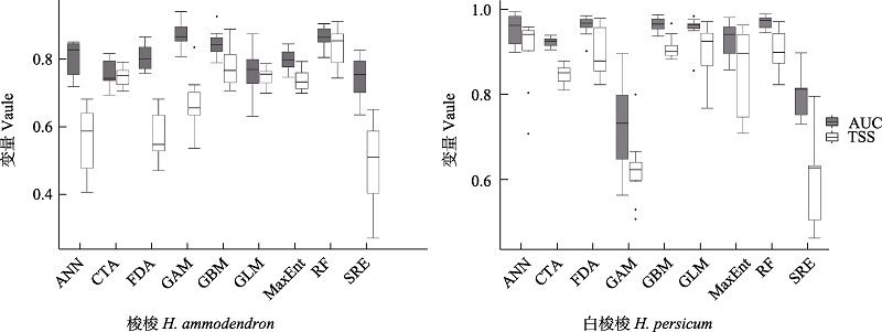 图1 不同模型预测精度评价。ANN: 人工神经网络; CTA: 分类树分析; FDA: 柔性判别分析; GAM: 广义相加模型; GBM: 推进式回归树; GLM: 广义线性模型; MaxEnt: 最大熵模型; RF: 随机森林; SRE: 表面分布区分室模型; AUC: 特征曲线下的面积; TSS: 真实技巧统计值。