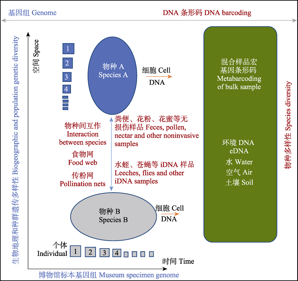 在分子生物学、细胞生物学、微生物学、遗传学等学科的推动下, 生物多样性研究从仅关注宏观表型的博物学, 迅速演化为涵盖生态系统、物种和遗传多样性等多个维度的综合性生命科学。组学技术, 尤其是DNA测序技术的更新和发展, 使获取DNA序列所需的成本大幅下降, 促进了近年来其在生物多样性研究中取得的一系列令人瞩目成就。本文将从物种水平的遗传多样性和群落水平的物种多样性两个层面总结和介绍与DNA相关的组学技术在生物多样性研究中的一些创新和应用。其中, 物种水平主要是总结单一个体的基因组和单物种多个体在时空多个维度上的群体遗传研究; 而群落水平的物种多样性层面主要总结现有的分子鉴定技术(metabarcoding, eDNA, iDNA等), 以及上述新技术在群落多样性评估、旗舰保护物种监测以及物种间相互作用关系等研究中的应用。