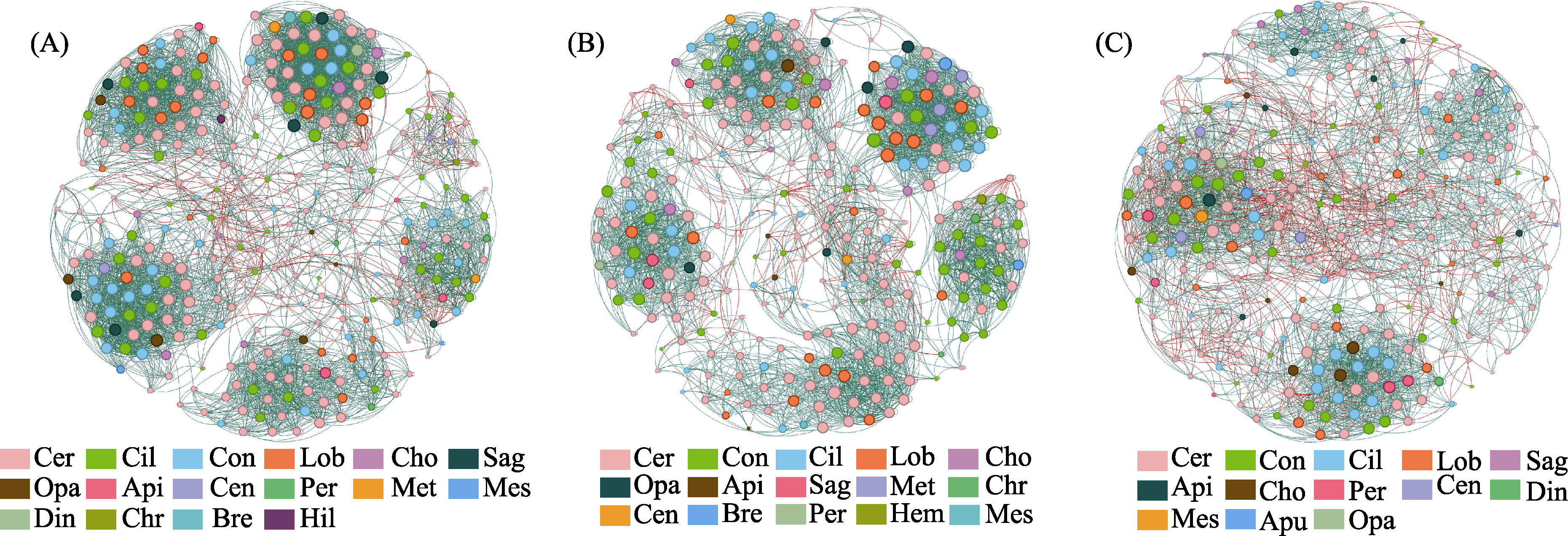 Fig. 6 Co-occurrence network of soil protozoa in different vegetation types. A node represents a family and each colour represents a phylum. Node size is proportional to abundance, and nodes with significant correlation are connected by lines, with green indicating positive correlation and red negative correlation. (A) Grassland; (B) Shrub; (C) Forest. Cer, Cercozoa; Cil, Ciliophora; Con, Conosa; Lob, Lobosa; Cho, Choanoflagellida; Sag, Sagenista; Opa, Opalozoa; Api, Apicomplexa; Cen, Centroheliozoa; Per, Perkinsea; Met, Metamonada; Mes, Mesomycetozoa; Din, Dinoflagellata; Chr, Chrompodellids; Bre, Breviatea; Hil, Hilomonadea; Hem, Hemimastigophora; Apu, Apusomonadidae.