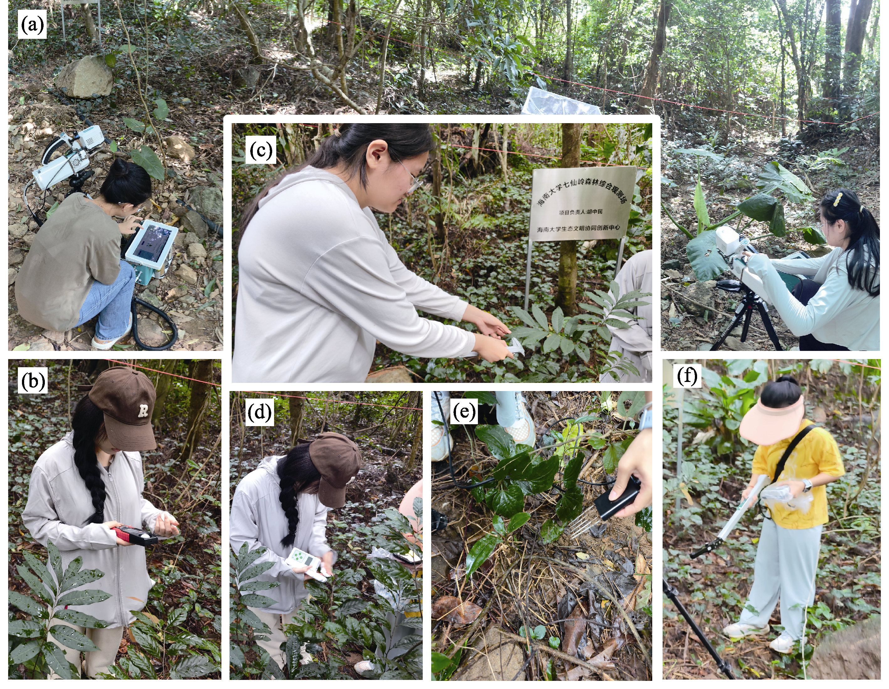图2 数据采集。(a)光合荧光气体交换测量; (b)光合有效辐射测量; (c)叶性状测量; (d)叶绿素测量; (e)土壤参数测量; (f)冠层参数测量。