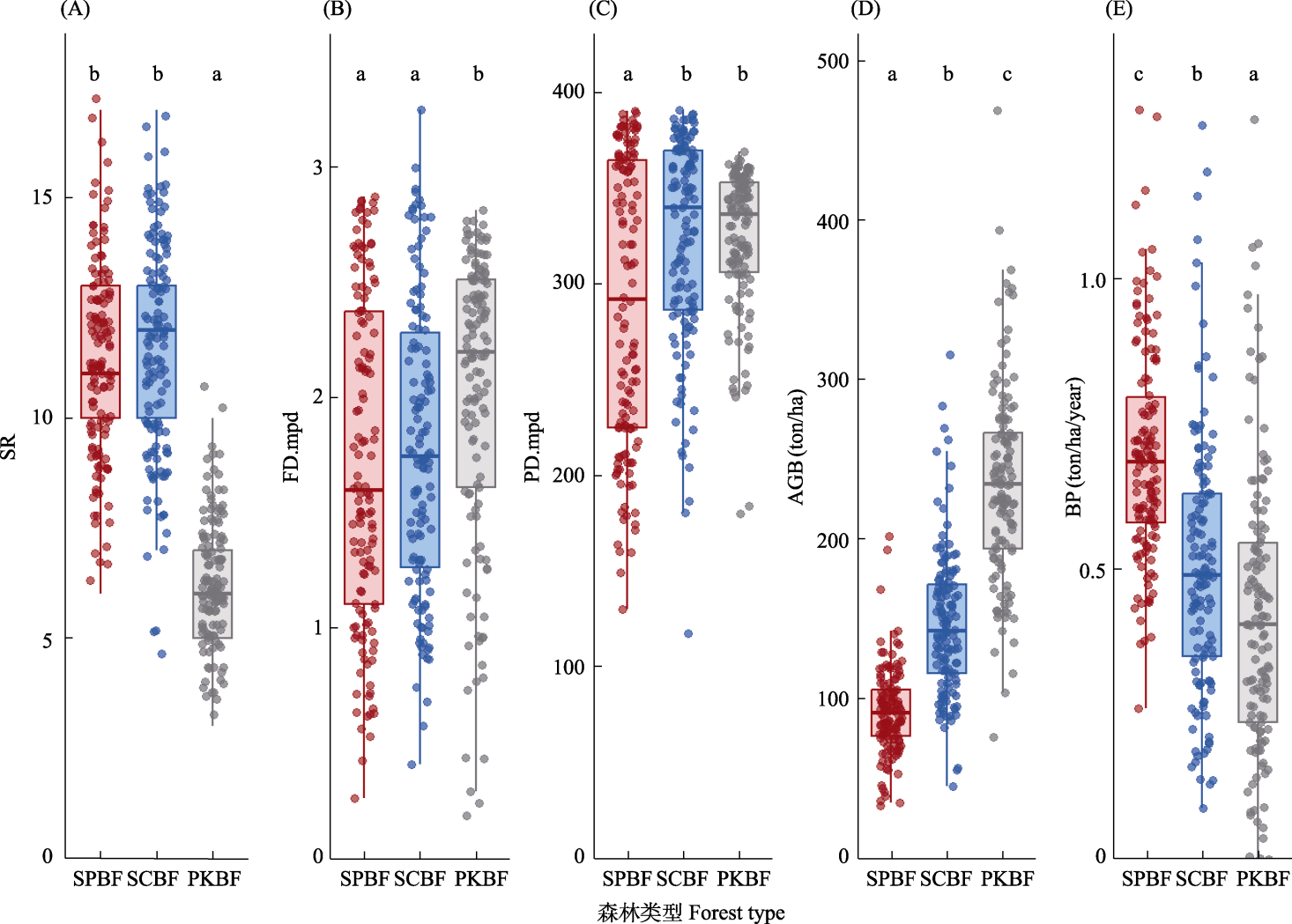 图2 长白山森林不同演替阶段各因子水平的差异。AGB: 地上生物量; FD.mpd: 功能多样性; PD.mpd: 系统发育多样性; SR: 物种丰富度; BP: 生产力; SPBF: 次生山杨-白桦林; SCBF: 次生针阔混交林; PKBF: 原始阔叶红松林。不同小写字母表示不同森林类型间差异显著(P < 0.05)。