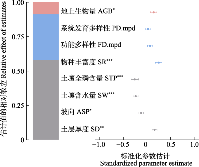 Fig. 3 广义线性模型拟合结果。* P < 0.0.5; ** P < 0.01; *** P < 0.001。 Results of generalized linear model fitting. AGB, Aboveground biomass; ASP, Aspect; FD.mpd, Functional diversity; PD.mpd, Phylogenetic diversity; SD, Soil depth; SR, Species richness; STP, Soil total phosphorus content; SW, Soil water content.* P < 0.05; ** P < 0.01; *** P < 0.001.