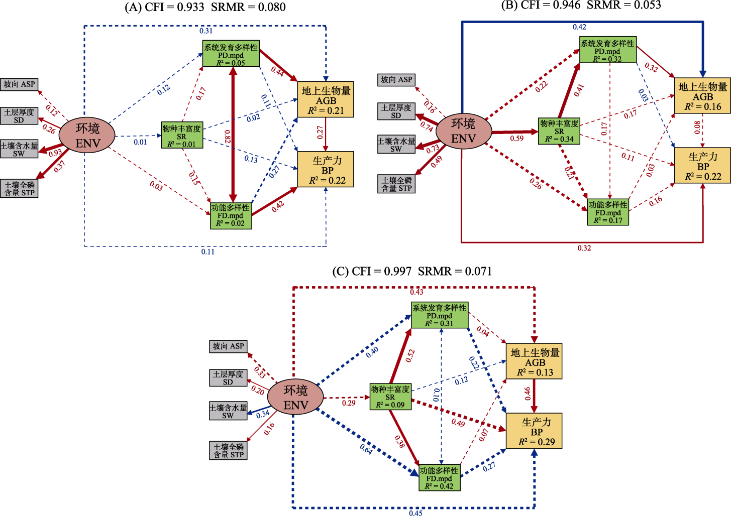 图4 结构方程模型分析结果。(A)次生山杨-白桦林; (B)次生针阔混交林; (C)原始阔叶红松林。CFI为比较拟合指数, SRMR为标准化均方根残差, 两者都反映了模型的拟合优度。红色路径线表示正相关关系, 蓝色路径线表示负相关关系; 实线表示关系显著(P < 0.05), 虚线表示关系不显著(P ≥ 0.05); 路径线上的数字为标准化的路径系数(r), 线条粗细反映系数的大小。