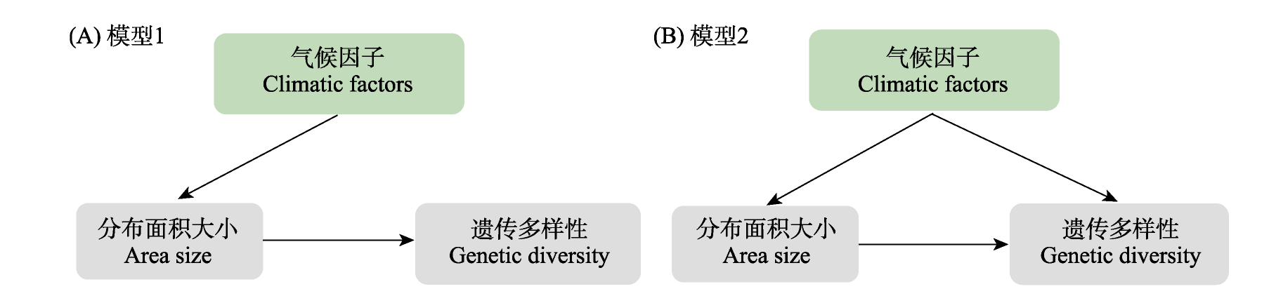 图1 结构方程模型检测的气候因子、分布面积大小和遗传多样性之间的关系。黑色箭头展示了两个因子之间的相互关系。(A)模型1: 遗传多样性与物种分布面积大小直接关联, 其中物种分布面积大小受气候因子的直接影响; 遗传多样性不受气候因子的直接影响; (B)模型2: 遗传多样性与物种分布面积大小直接关联, 物种分布面积大小与遗传多样性均直接受到气候因子的影响。