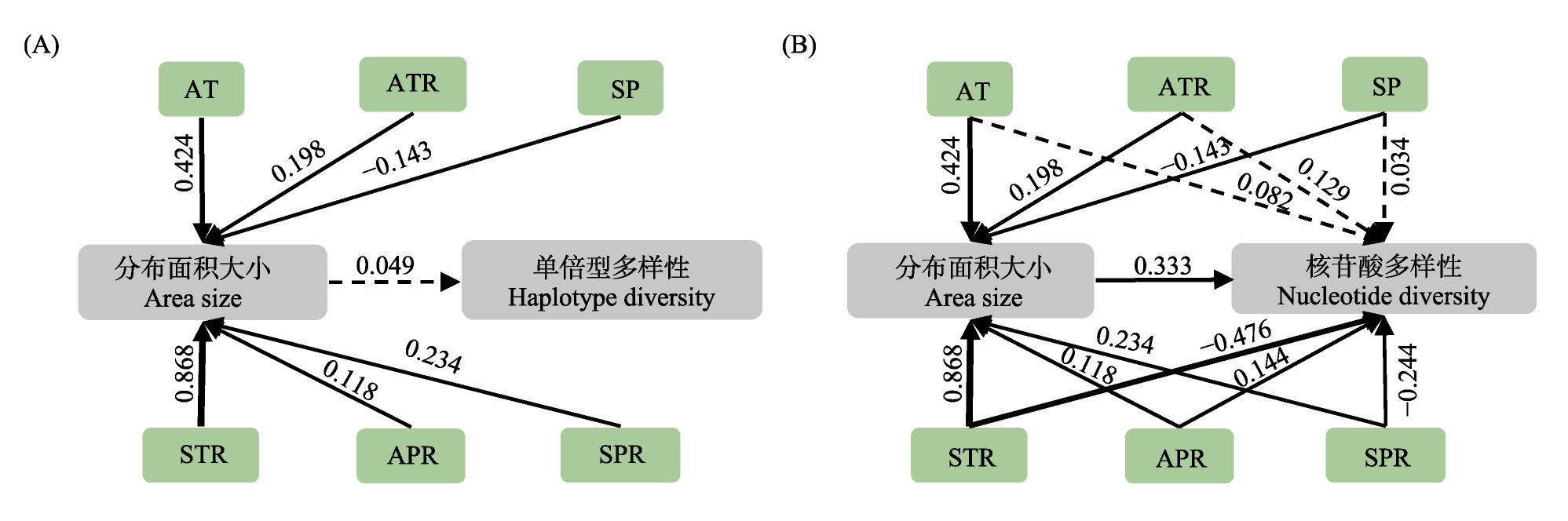 图3 气候因子、分布面积和遗传多样性(A: 单倍型多样性; B: 核苷酸多样性)的最优结构方程模型。黑色实线/虚线箭头分别表示类群特异的显著/不显著的相关方向。图中线段的粗细对应于其所标注的标准化路径系数的大小。图中涉及的气候因子为年均温(AT)、年均温范围(ATR)、温度季节性范围(STR)、年降水范围(APR)、降水季节性(SP)和降水季节性范围(SPR)。