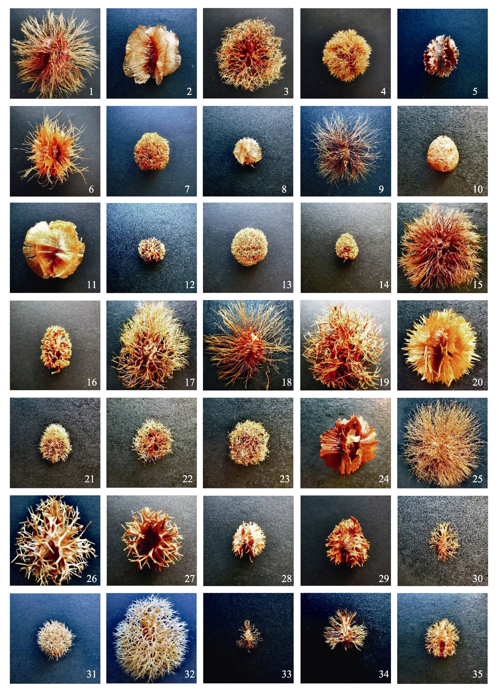 Fig. 1 Fruit diversity of Calligonum in Central Asia. 1, C. acanthopterum; 2, C. aphyllum; 3, C. arborescens; 4, C. caput-medusae; 5, C. cordatum; 6, C. coriaceum;7, C. densum; 8, C. dubjanskyi; 9, C. eriopodum; 10, C. junceum; 11, C. leucocladum; 12, C. litwinowi; 13, C. matteianum; 14, C. microcarpum; 15, C. molle; 16, C. murex; 17, C. orthotrichum; 18, C. paletzkianum; 19, C. platyacanthum; 20, C. rotula; 21, C. rubescens; 22, C. comosum; 23, C. griseum; 24, C. rubicundum; 25, C. santoanum; 26, C. squarrosum; 27, C. undulatum; 28, C. tetrapterum; 29, C. tortile; 30, C. triste; 31, C. macrocarpum; 32, C. mongolicum; 33, C. erinaceum; 34, C. elatum; 35, C. roborowskii.