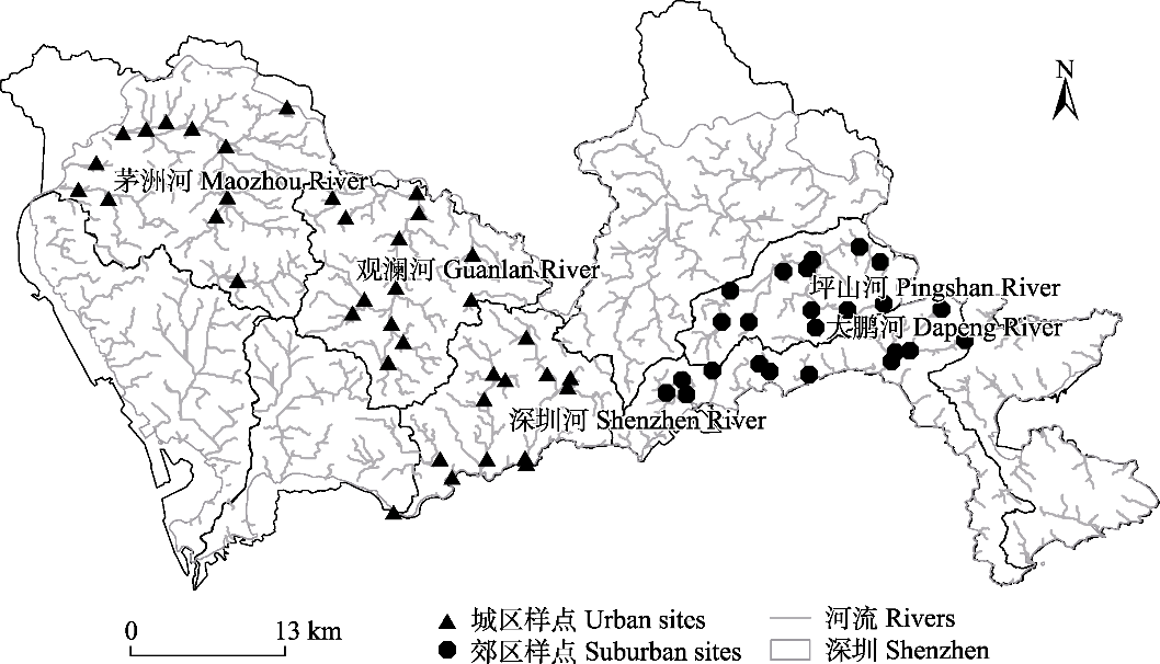 表3 深圳地区城区和郊区河流样点土地利用因子(平均值 ± 标准差)