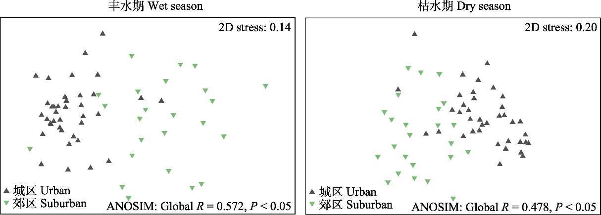 图2 深圳地区丰水期和枯水期城区和郊区河流底栖动物群落非度量多维尺度分析(NMDS)