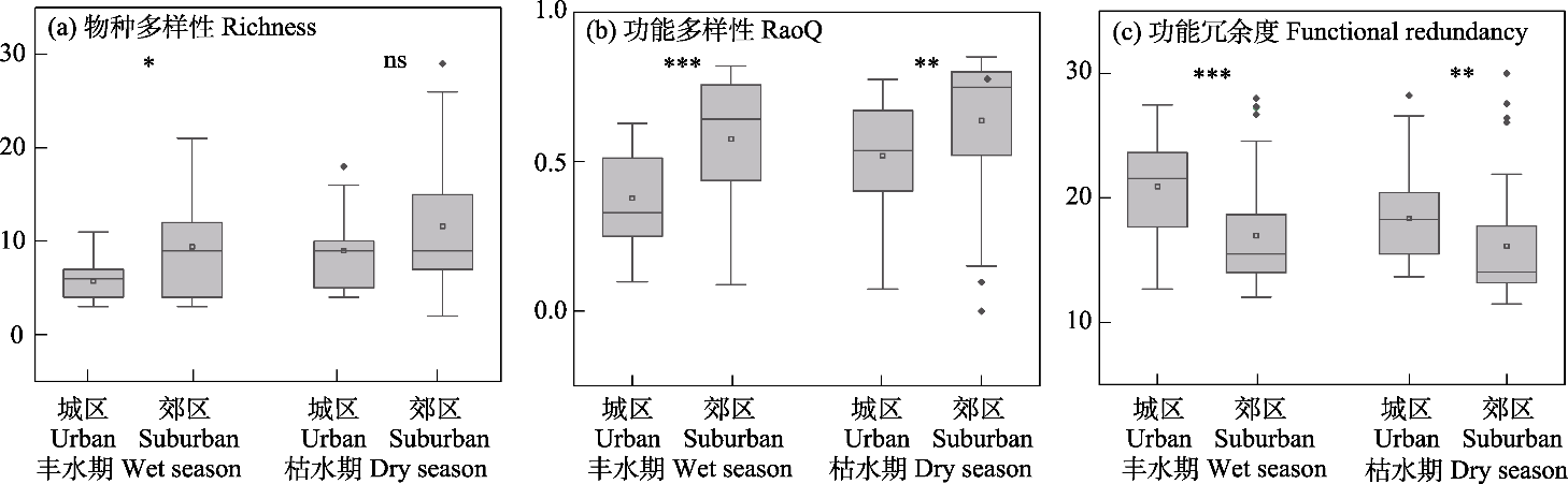 图3 深圳地区丰水期和枯水期城区和郊区河流底栖动物群落物种多样性(物种数)、功能多样性(RaoQ指数)及功能冗余度。* P < 0.05; ** P < 0.01; *** P < 0.001。