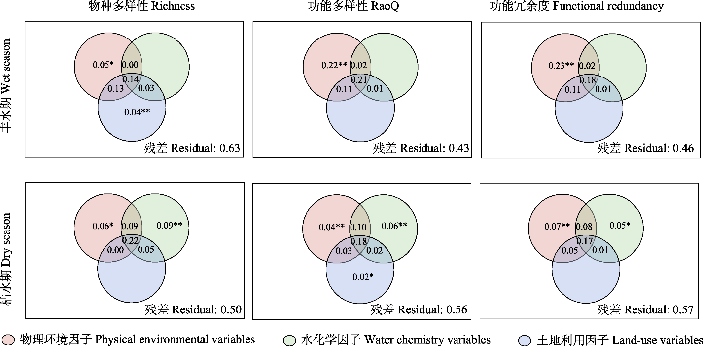 图4 丰水期和枯水期局域物理环境、水化学及土地利用因子对底栖动物群落物种多样性(物种数)、功能多样性(RaoQ指数)及功能冗余度变异的解释率