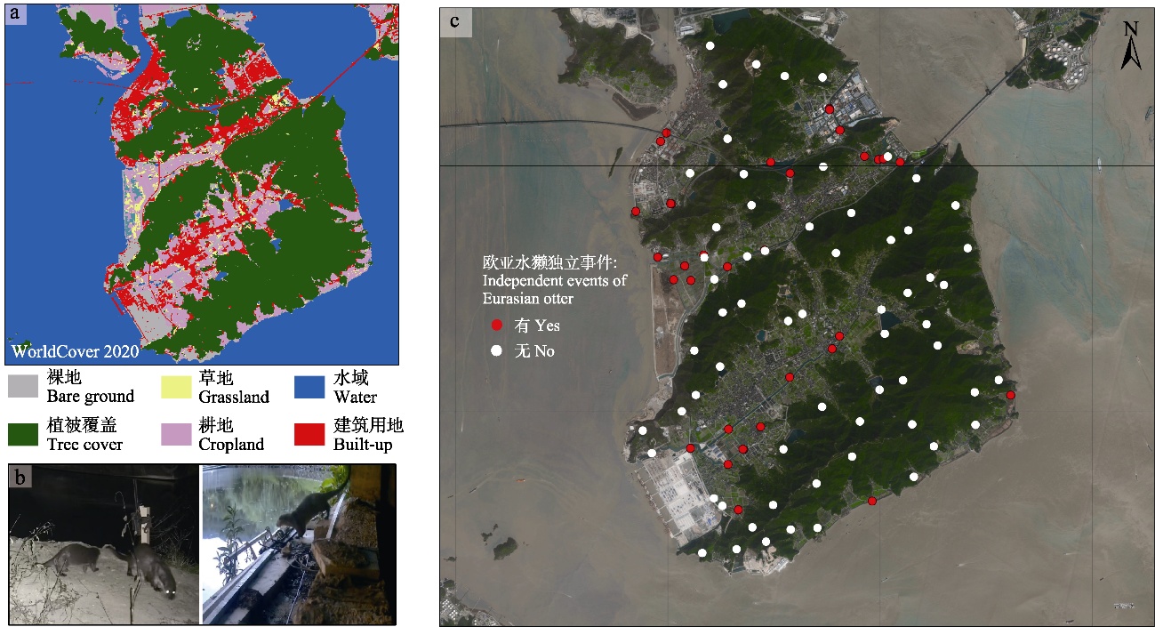 图1 中国浙江省金塘岛研究区域的土地覆盖情况(a)、欧亚水獭监测影像(b)及红外相机布设位置(c)