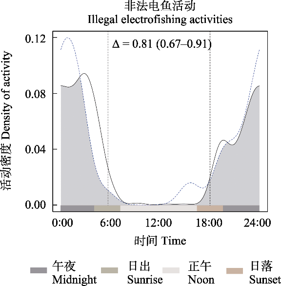 图3 欧亚水獭与非法电鱼活动的时间重叠情况。实线是欧亚水獭的活动模式, 虚线表示非法电鱼活动时间分布。灰色区域的面积大小表示欧亚水獭与非法电鱼活动的重叠程度, Δ表示时间重叠系数, 括号内的数值为Δ的95%置信区间。垂直的虚线表示在相机工作期间的平均日出和日落时间, 时间轴中日出和日落时段表示物种晨昏活动(日出前后1 h之间活动、日落前后1 h之间活动), 正午时段表示物种白天的活动(日出后1 h至日落前1 h之间活动), 而午夜时段则表示物种夜间的活动(日落后1 h至日出前1 h之间活动)。
