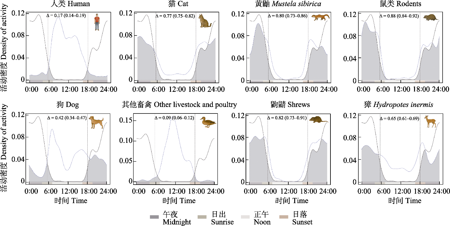 图2 欧亚水獭与人类、猫、黄鼬、鼠类、狗、其他畜禽、鼩鼱和獐之间的活动节律重叠情况。实线是欧亚水獭的活动模式, 虚线表示其他物种的活动模式。灰色区域的面积大小表示两个物种日活动节律之间的重叠程度, Δ表示时间重叠系数, 括号内的数值为Δ的95%置信区间。垂直的虚线表示在相机工作期间的平均日出和日落时间, 时间轴中日出和日落时段表示物种晨昏活动(日出前后1 h之间活动、日落前后1 h之间活动), 正午时段表示物种白天的活动(日出后1 h至日落前1 h之间活动), 而午夜时段则表示物种夜间的活动(日落后1 h至日出前1 h之间活动)。