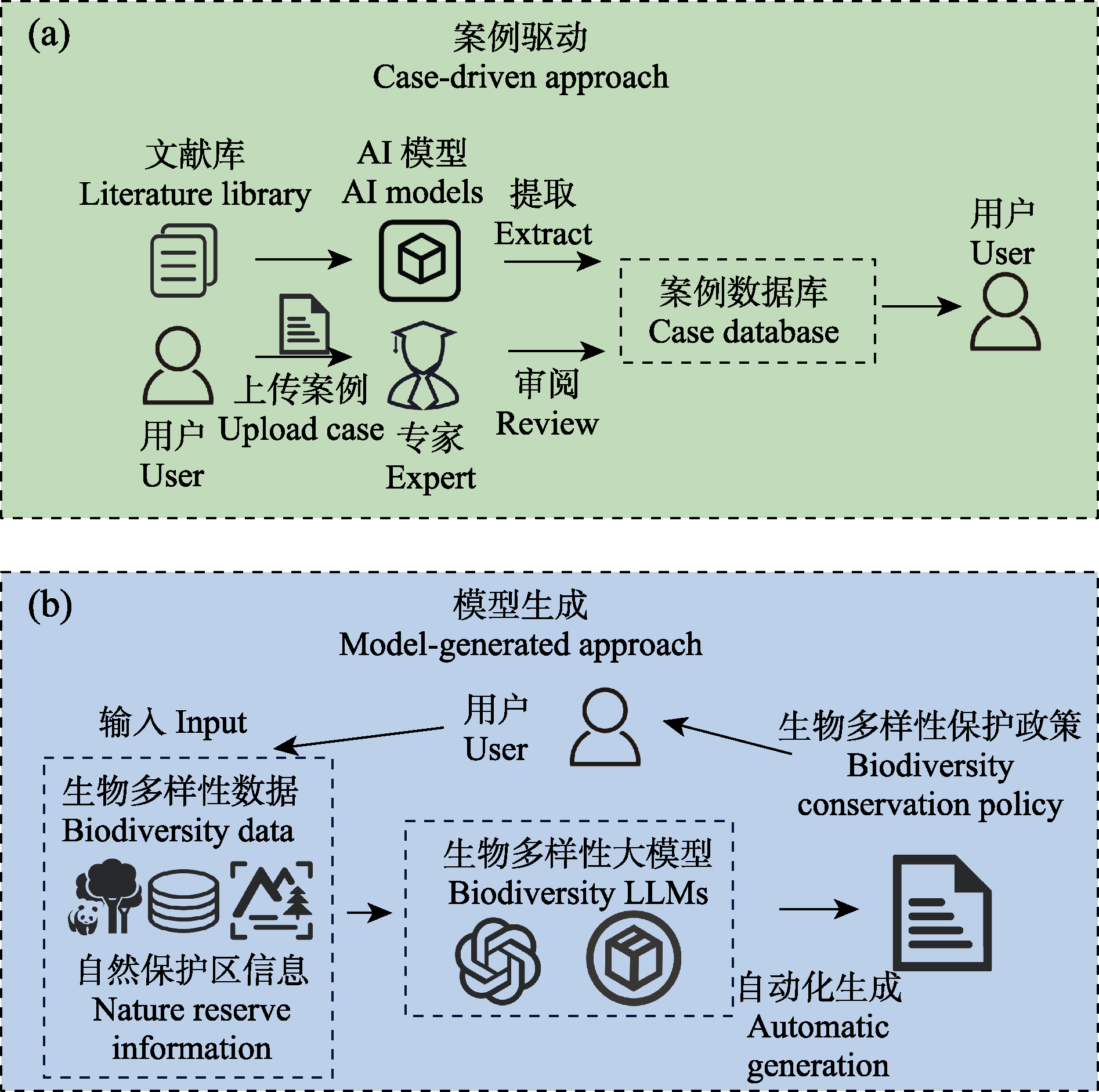 图2 案例驱动(a)和模型生成(b)两种不同的技术路径。AI:人工智能(AI); LLMs: 大语言模型。