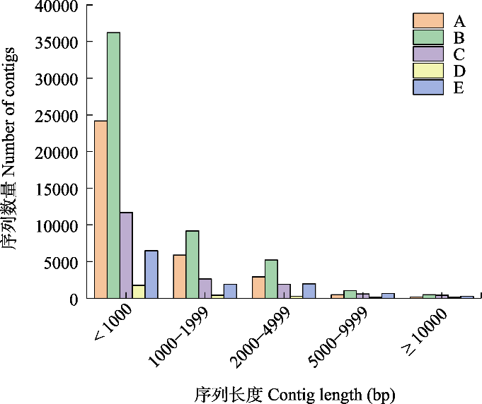 图1 西溪湿地不同斑块类型的contig长度分布图。A: 乔灌草地; B: 灌草地; C: 芦苇地; D: 池塘; E: 浅滩。