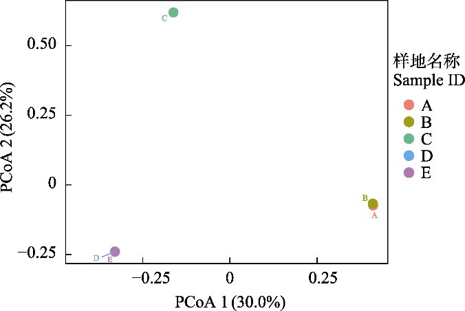 图2 西溪湿地不同斑块类型的病毒群落结构。A: 乔灌草地; B: 灌草地; C: 芦苇地; D: 池塘; E: 浅滩。