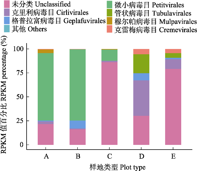 Fig. 2 Viral community structure of different habitat types in Xixi Wetland. A, Trees, shrubs and grasslands; B, Shrub grasslands; C, Reed marshes; D, Ponds; E, Shoals.