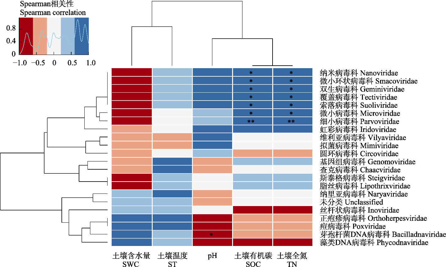 图4 西溪湿地病毒科水平与土壤理化性质的相关关系。* P < 0.05, ** P < 0.01。