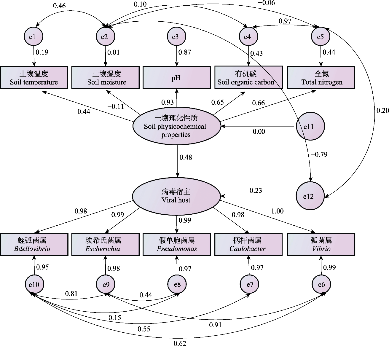 图5 土壤理化性质与病毒宿主结构方程模型。e为残差项; 单箭头为变量间的直接影响关系, 其正值代表正相关(越高相关性越大), 负值代表负相关(其绝对值越高相关性越大); 双箭头为拟合线, 其正值表示观察值大于模型预测值, 负值代表观察值小于模型预测值。