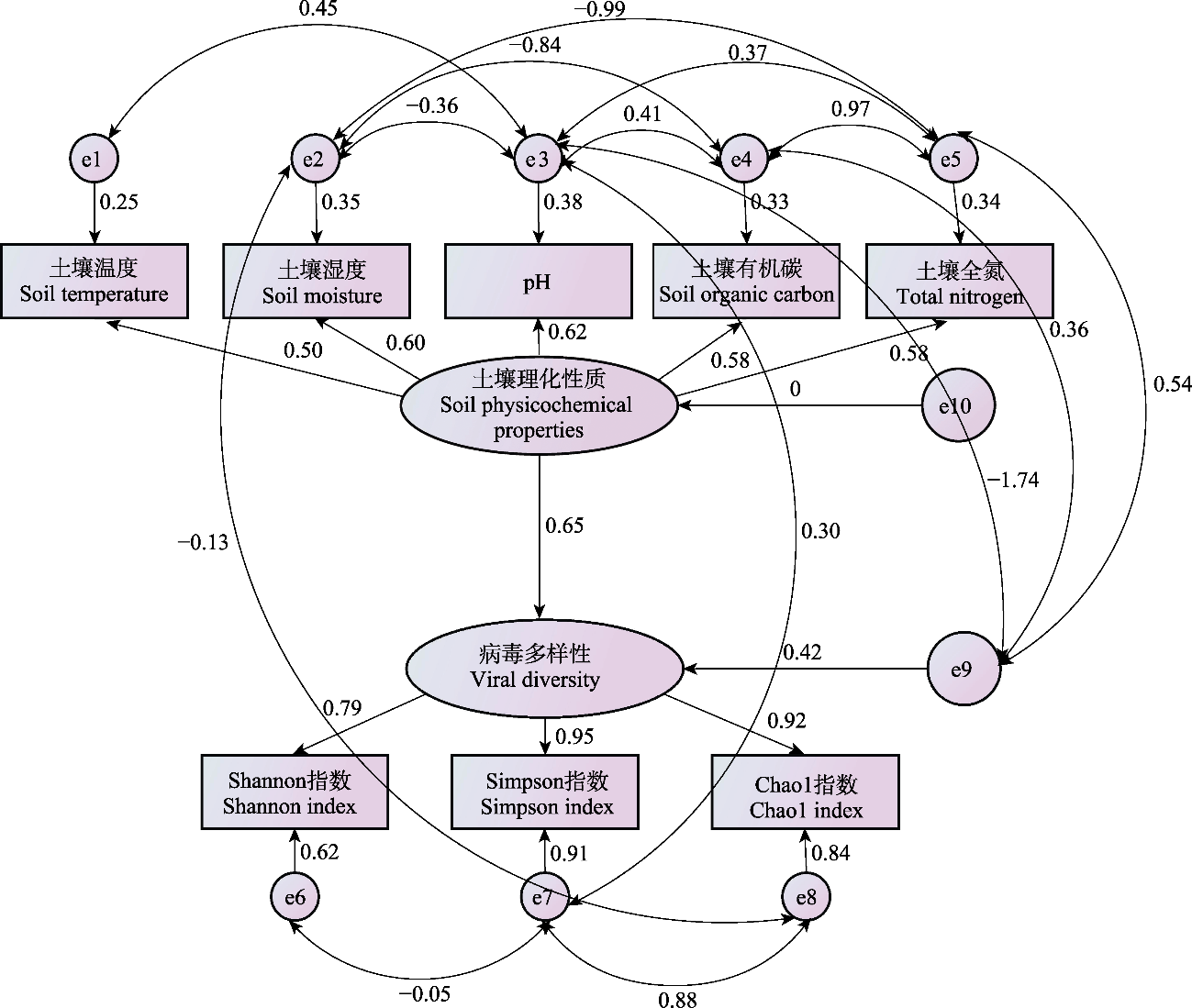 图6 土壤理化性质与病毒多样性的结构方程模型。e为残差项; 单箭头为变量间的直接影响关系, 其正值代表正相关(越高相关性越大), 负值代表负相关(其绝对值越高相关性越大); 双箭头为拟合线, 其正值表示观察值大于模型预测值, 负值代表观察值小于模型预测值。