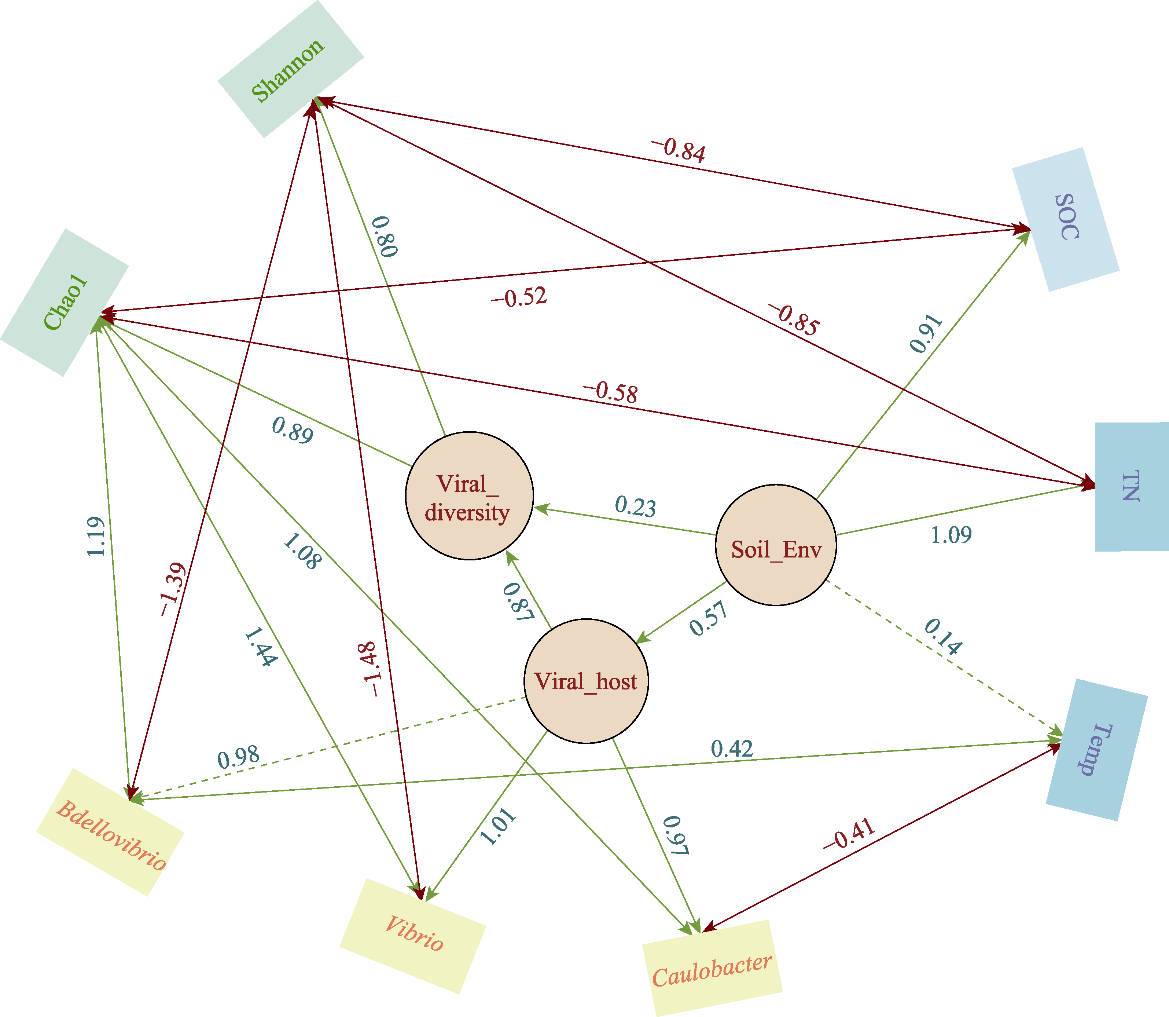 图7 土壤理化性质-病毒宿主-病毒多样性的结构方程模型。绿实线单向箭头(指向观测变量)表示直接正相关, 绿虚线单向箭头表示间接相关性, 双箭头为拟合线, 实心红线表示直接负相关; 负值代表负面(抑制性效应), 正值则代表正面效应。Bdellovibrio: 蛭弧菌属; Vibrio: 弧菌属; Caulobacter: 柄杆菌属; Chao1: Chao1指数; Shannon: Shannon指数; SOC: 土壤有机碳; TN: 土壤全氮; Temp: 温度; Viral_diversity: 病毒多样性; Viral_host: 病毒宿主; Soil_Env: 土壤环境。