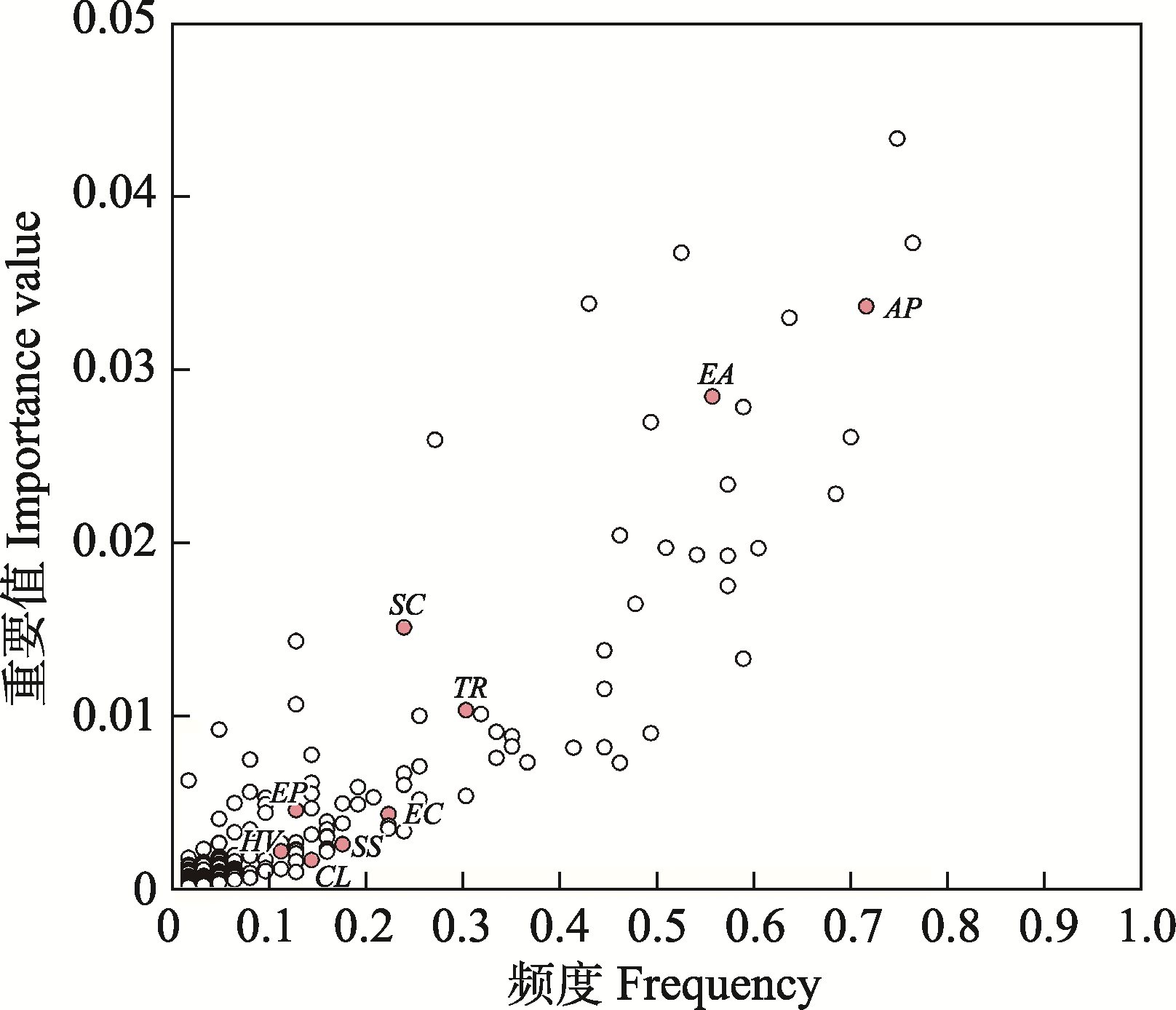 图2 杭州西溪国家湿地公园9个优势入侵植物的相对优势。AP: 空心莲子草; EA: 一年蓬; SC: 加拿大一枝黄花; TR: 白车轴草; EC: 小蓬草; SS: 钻叶紫菀; CL: 细叶旱芹; EP: 春飞蓬; HV: 南美天胡荽。