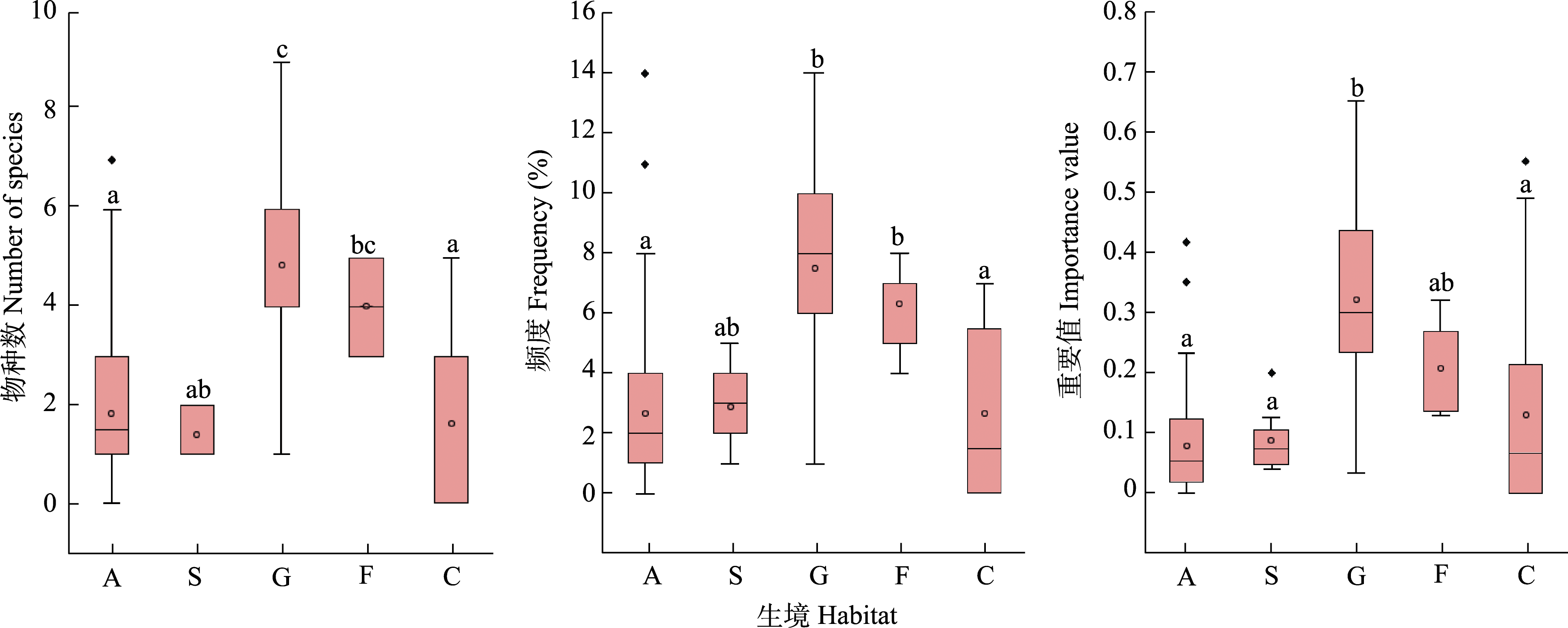 图3 杭州西溪国家湿地公园不同生境中入侵植物物种数、频度和重要值的差异。A: 乔木林地; S: 灌木林地; G: 草地; F: 农用地; C: 建筑用地。不同小写字母表示差异显著(P < 0.05)。