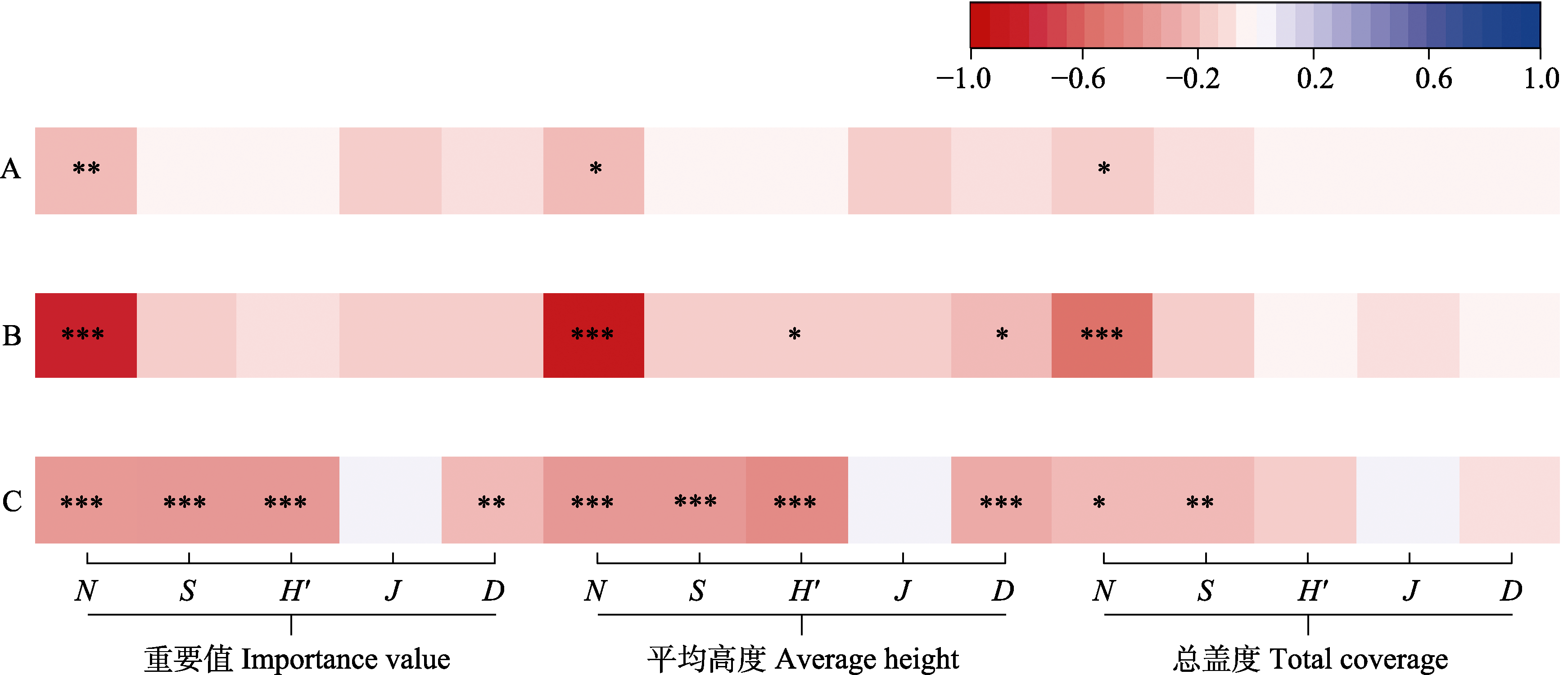 图4 杭州西溪国家湿地公园入侵植物与群落多样性的相关性。N: 本土植物物种数; S: 物种丰富度指数; H′: Shannon-Wiener多样性指数; J: Pielou均匀度指数; D: Simpson多样性指数。偏相关分析的控制项: A: 人工地被平均高度 × 总盖度; B: 人工地被平均高度 × 总盖度和样带总物种数; C: 人工地被平均高度 × 总盖度和入侵植物物种数。方格颜色代表相关系数, 与色带条的颜色对应。* P < 0.05; ** P < 0.01; *** P < 0.001。