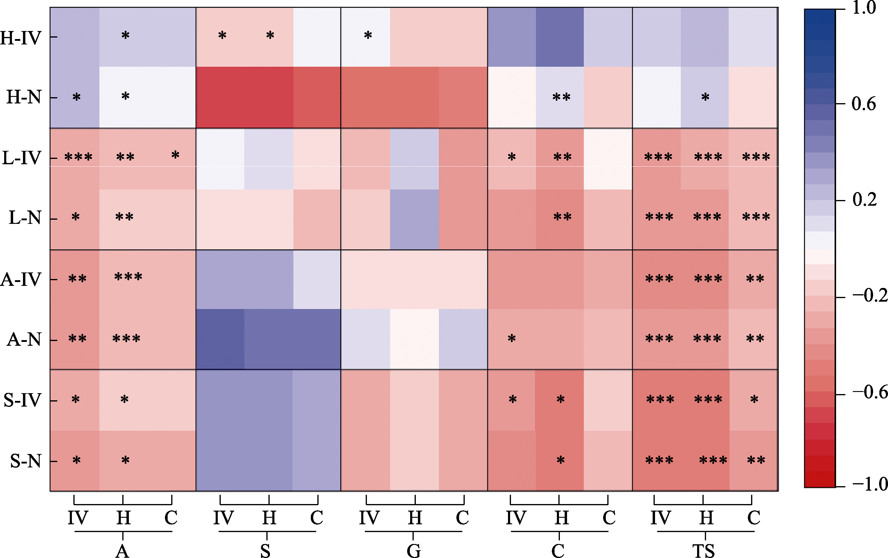 Fig. 5 Correlation between invasive plants and community structure in Hangzhou Xixi National Wetland Park. The ordinate is the parameters of community structure: H-IV, Importance value of herb; H-N, Number of herb; L-IV, Importance value of lianas; L-N, Number of lianas; A-IV, Importnce value of arbor seedling; A-N, Number of arbor seedling species; S-IV, Importance value of shrub seedling; S-N, Number of shrub seedling species. The abscissa is the parameters of the invasive plants: IV, Importance value of invasive plants; H, Average height of invasive plants; C, Total coverage of invasive plants. A, Arbor woodland; S, Shrub land; G, Grassland; C, Construction land; TS represents all types of habit. The color of the squares represents the correlation coefficient, corresponding to the color of the color band. * P < 0.05; ** P < 0.01; *** P < 0.001.