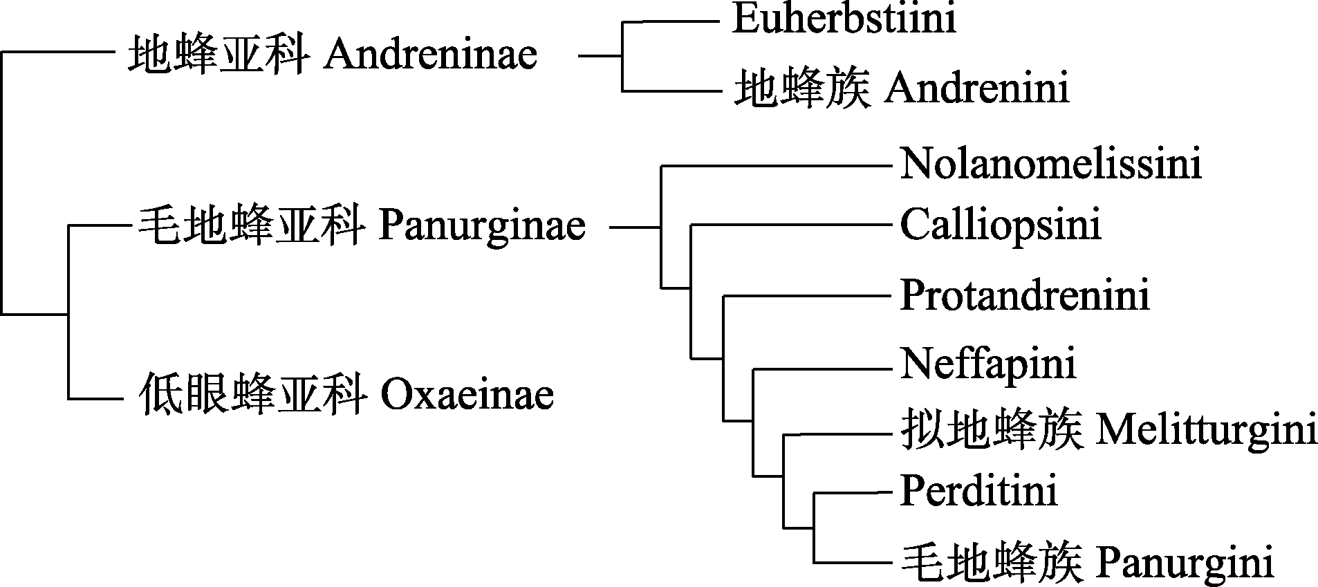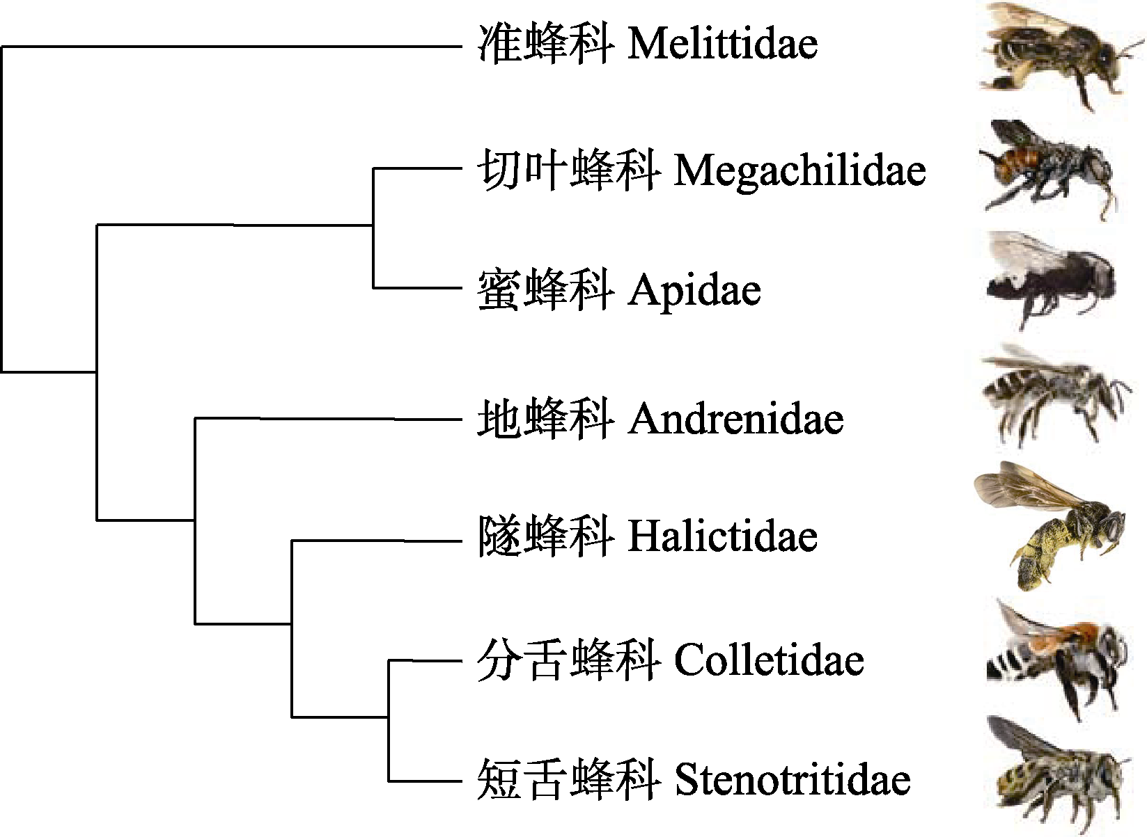 图1 蜜蜂类系统发生关系。基于Branstetter等(2017)。蜜蜂图片从上至下为Macropis europaea、Ashmeadiella xenomastax、Isepeolus wagenknechti、Alocandrena sp.、Dieunomia heteropoda、Caupolicana fulvicollis和Stenotritus pubescens, 均来自维基共享资源。