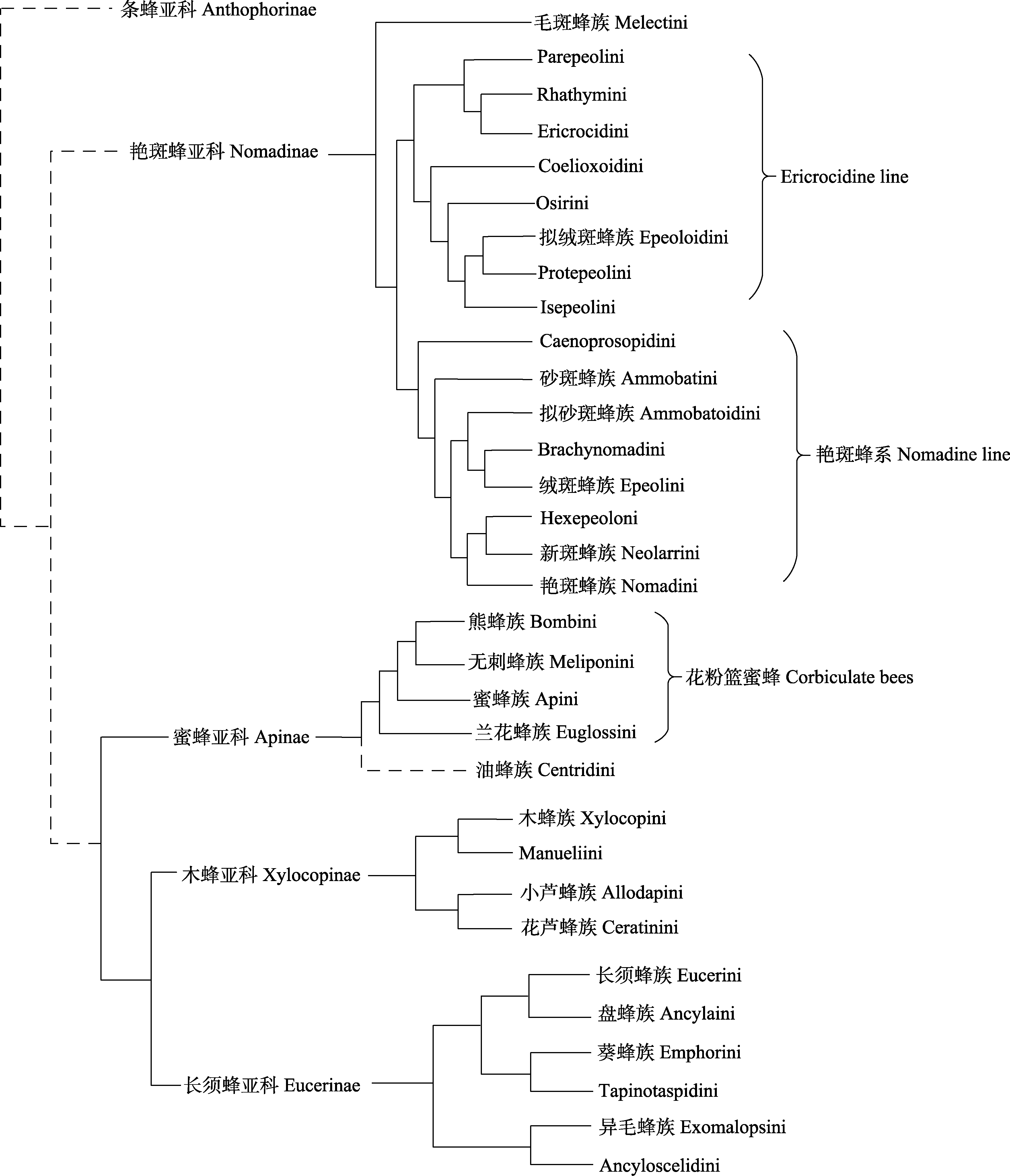 图2 基于当前研究共识的蜜蜂科主要谱系系统发生关系。其中虚线为争议类群, 详细信息见附录2。