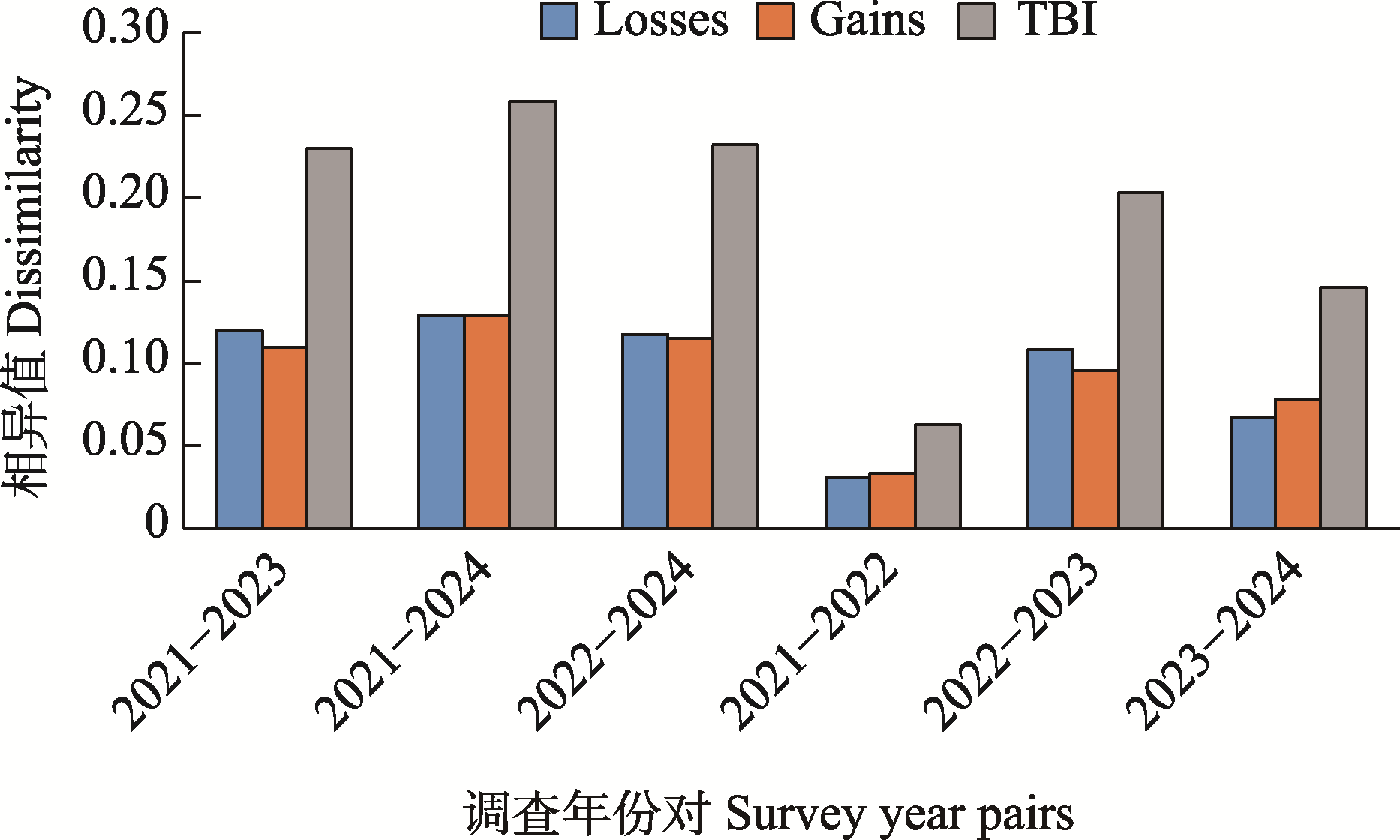 Fig. 1 Changes in temporal beta diversity index (TBI) and its components, losses and gains, in the seedling community of 20-ha warm temperate deciduous broad-leaved forest dynamics plot in Donglingshan from 2021 to 2024. Losses represents species loss, and Gains represents species gain. A TBI value of 1 indicates that the species composition of the area has completely changed over the time span. A Losses value of 1 indicates that the area is dominated entirely by species loss over the time span. A Gains value of 1 indicates that the area is dominated entirely by species gain over the time span.
