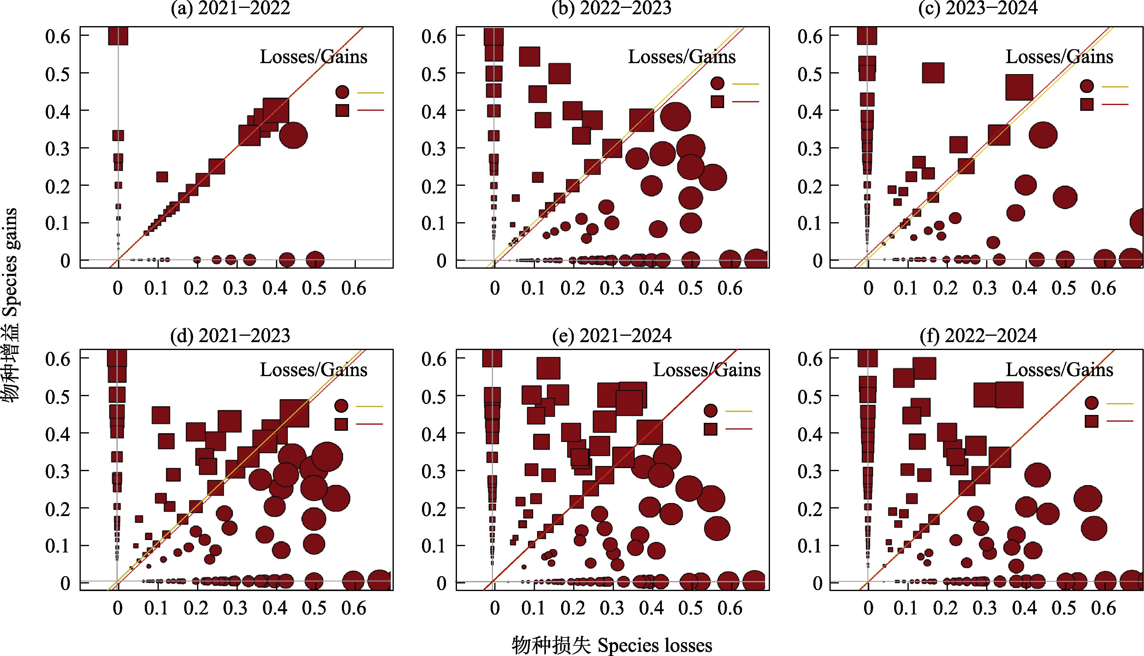 Fig. 2 Gains/losses of seedling communities in the 20-ha warm temperate deciduous broad-leaved forest dynamics plot in Donglingshan. Squares (Gains) and circles (Losses) represent 450 seedling quadrats (points). The red and yellow lines are parallel (with a slope of 1). The size of the symbols is proportional to the TBI statistic. If the yellow line is above the red line, it indicates that species losses dominate; conversely, species gains dominate.