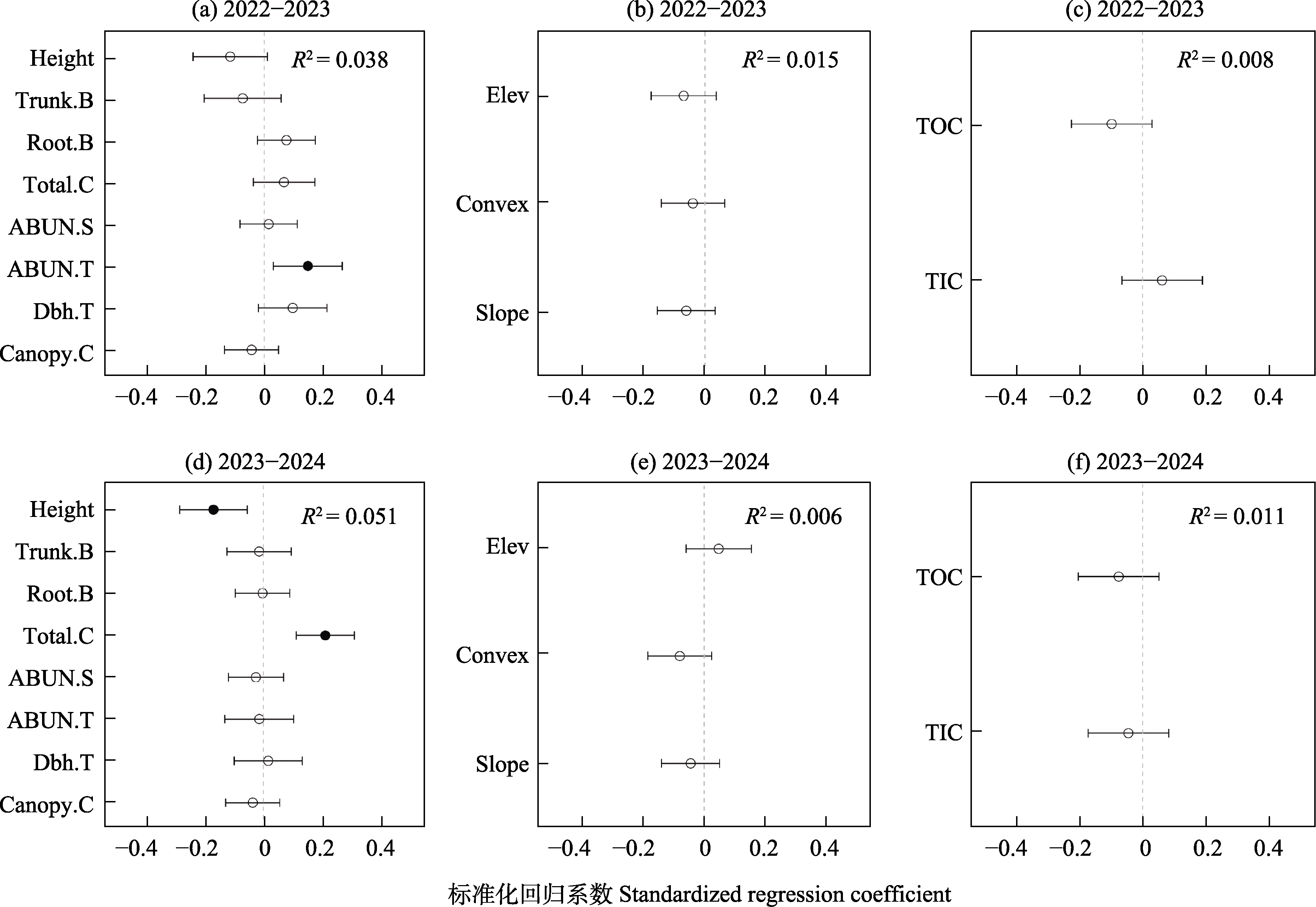 图3 东灵山20 ha暖温带落叶阔叶林动态监测样地幼苗群落2022-2024年生物(a、d)、地形(b、e)和土壤(c、f)因子对时间beta多样性指数(TBI)的影响。Height: 幼苗平均高度; Trunk.B: 幼苗平均主干叶片数量; Root.B: 幼苗平均根萌叶片数量; Total.C: 幼苗总盖度; ABUN.S: 幼苗多度; ABUN.T: 树木多度; Dbh.T: 树木胸径; Canopy.C: 冠层盖度; Elev: 海拔; Convex: 凹凸度; Slope: 坡度; TOC: 总有机碳; TIC: 总无机碳; 圆圈和短线分别代表标准化回归系数估计值和95%置信区间。实心圆代表效应显著(P < 0.05), 空心圆代表不显著(P ≥ 0.05)。