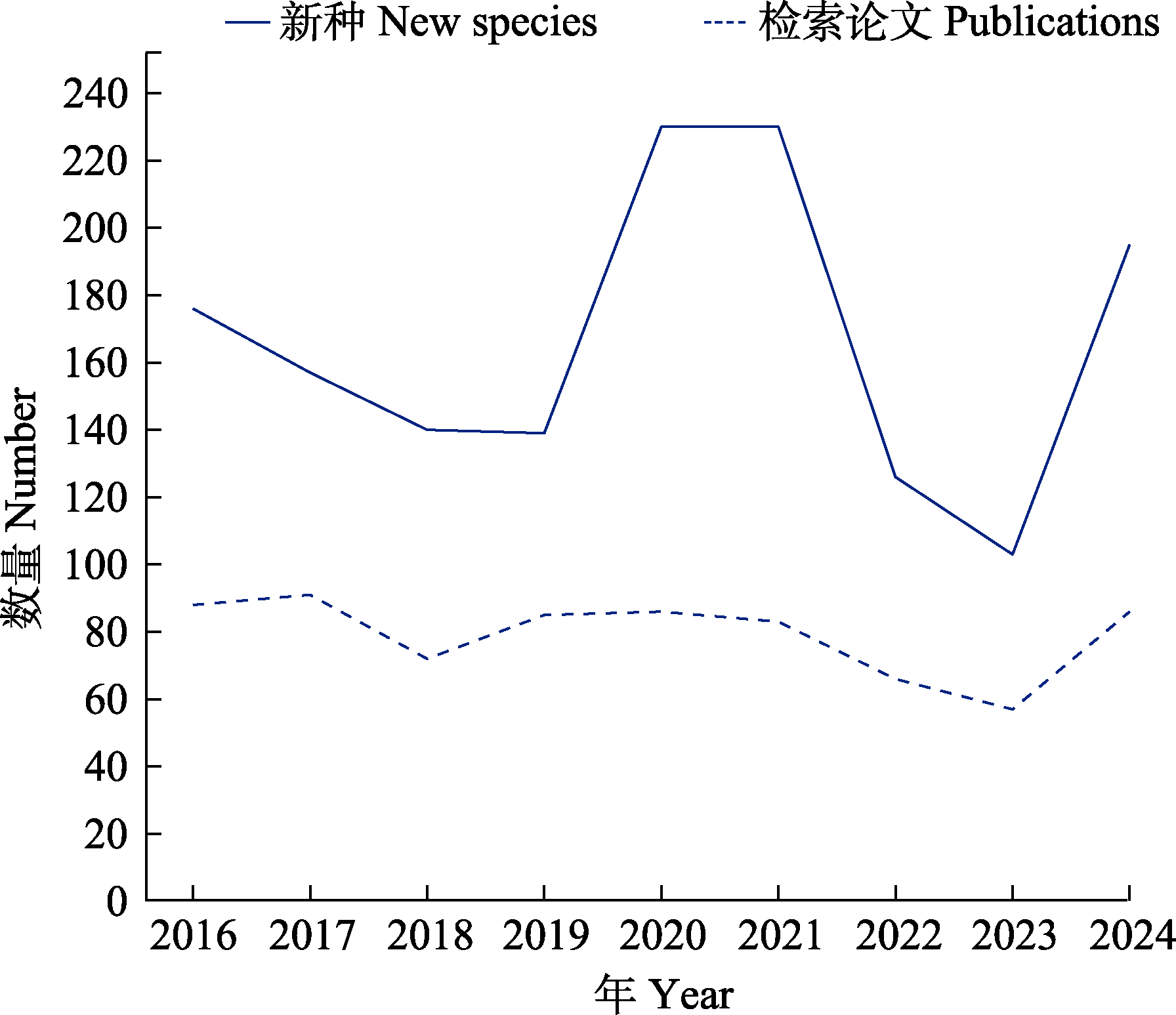 图1 2016-2024年中国膜翅目新种及相关期刊论文的年度发表数量
