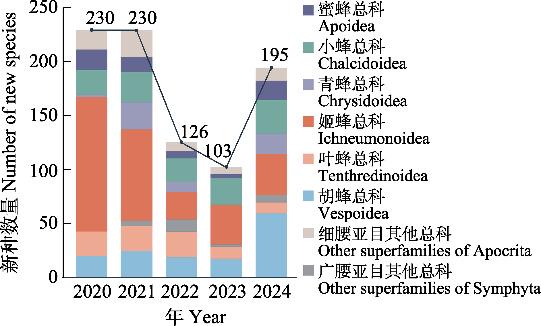 膜翅目昆虫是动物界中类群最为庞大和生态功能最为多样的重要类群之一, 在维持生态系统稳定性和提供多种生态系统服务中发挥着核心作用。为了全面呈现2024年中国膜翅目新分类单元发表进展, 本文基于系统的数据库检索与文献整理, 对2024年全球新发表的现生膜翅目分类单元进行统计与分析。结果显示, 2024年全球共发表427篇相关研究论文, 发表1,420个新分类单元, 包括2个新亚科、36个新属、19个新亚属、1,362个新种和1个新亚种, 隶属于18个总科、58个科和419个属。其中, 姬蜂总科、青蜂总科和胡蜂总科的新种数量最多, 分别占全球新种总数的28.5% (388/1,362)、18.1% (247/1,362)和16.1% (219/1,362)。在区域分布上, 亚洲仍是膜翅目新种发表的最重要来源地(45.7%, 622/1,362), 其中东亚贡献最高(20.5%, 279/1,362)。中国共发表新分类单元196个, 包括1个新属和195个新种。中国新种数量位列全球首位, 占全球同期发表新种总数的14.3%, 隶属于11个总科、26个科和81个属。中国发表的新种主要集中于胡蜂总科(30.8%, 60/195)、姬蜂总科(19.5%, 38/195)和小蜂总科(15.9%, 31/195)。此外, 中国学者还报道了9个新记录属和89个新记录种, 进一步丰富了区域膜翅目多样性资料。在发表载体方面, 2024年涉及现生膜翅目新分类单元的论文分布于100个期刊, 其中英文论文占绝对优势(96.7%, 413/427)。全球共有509位学者参与命名, 其中中国学者108人, 占比21.2%。综上所述, 2024年全球膜翅目分类学研究继续呈现活跃态势, 中国在新分类单元的发表数量和命名人参与度方面均居世界前列, 凸显了中国在膜翅目分类学研究和昆虫多样性保护中的重要学术力量, 这不仅反映了我国分类学研究能力的快速提升, 也为全球膜翅目多样性认识与保护提供了坚实的科学基础。