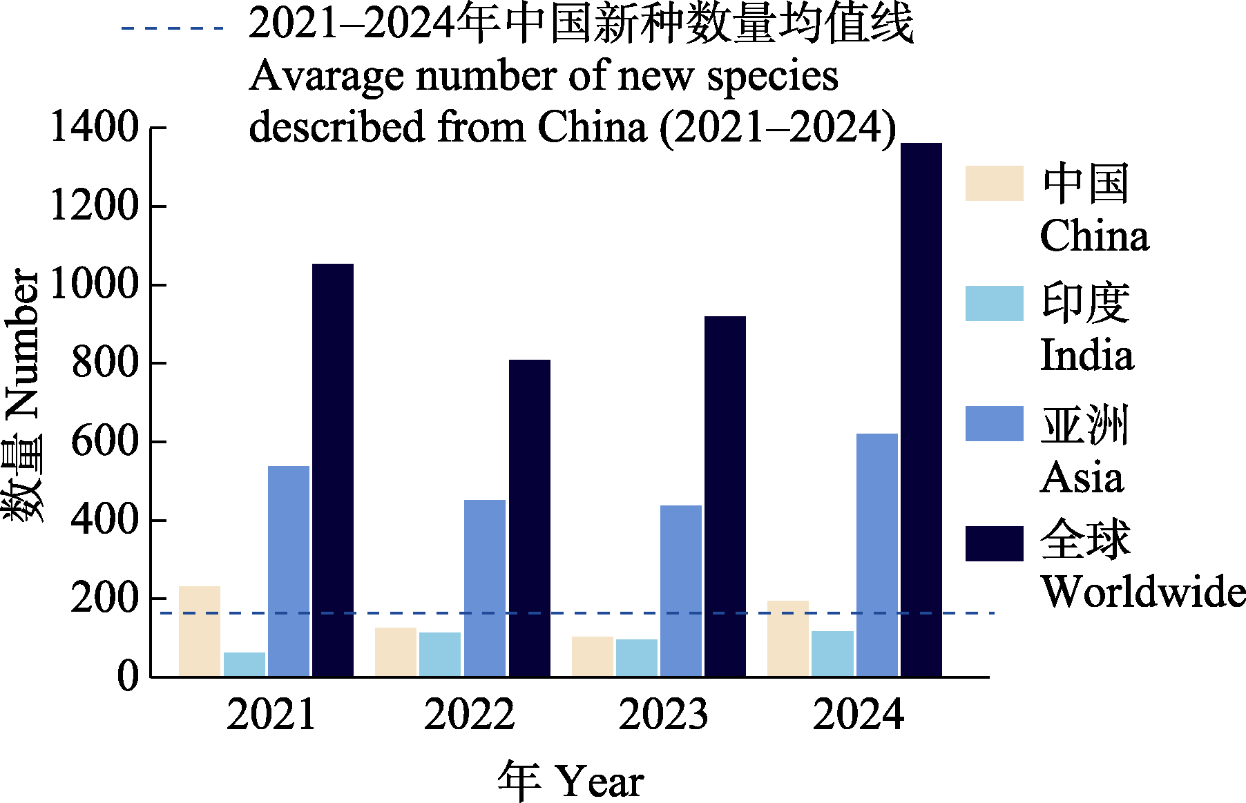 图3 2021-2024年中国、印度、亚洲、全球膜翅目新种数量对比