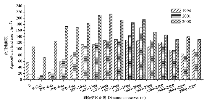 Fig. 4 Agricultural land areas around the reserves in Baicaohe watershed. Distance “0” indicates the regions inside the reserves.