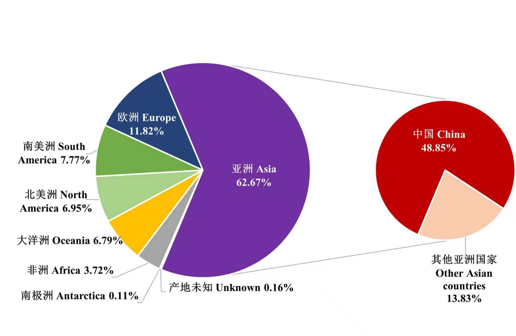 生物多样性是支撑人类可持续发展和生态系统稳定的重要基础。发现并描述新的生物物种, 定期梳理并更新物种名录, 是生物多样性研究、保护及可持续利用的重要途经。本文总结了2024年全世界发表的蜘蛛目新分类单元。394位学者发表了83个国家或地区的1,048个新分类单元, 包括54新属994新种, 隶属68科。这些新分类单元发表在65种刊物的329篇文章中, 其中科和属水平的修订、地区志或专著类的文章共有57篇, 占文章总数的17.3%; 运用DNA分子数据分析方法的论文共计49篇, 占文章总数的14.9%; 644个新种是基于雌雄两性标本发表, 占新种总数的64.8%; 350个新种仅基于雄或雌性标本发表, 占新种总数的35.2%。中国是2024年发现蜘蛛目新种最多的国家, 共309种, 占世界新种总数的31.1%。中国学者李枢强是2024年命名蜘蛛目新分类单元数量最多的学者, 共命名144个, 占世界新分类单元总数的13.7%。此外, 无论是命名蜘蛛目新分类单元数量还是参与命名新分类单元的学者数量, 均是中国学者位于第一。中国共有92位学者参与命名, 占世界新分类单元命名学者总数的23.4%; 这92位学者命名了中国和越南等8个国家或地区18新属326新种, 合计344个新分类单元, 命名新分类单元数量占世界32.8%。该贡献率高于2016–2020年的平均贡献率28.1%, 但较2021年的33.8%、2022年的37.0%和2023年的41.2%有所下降。