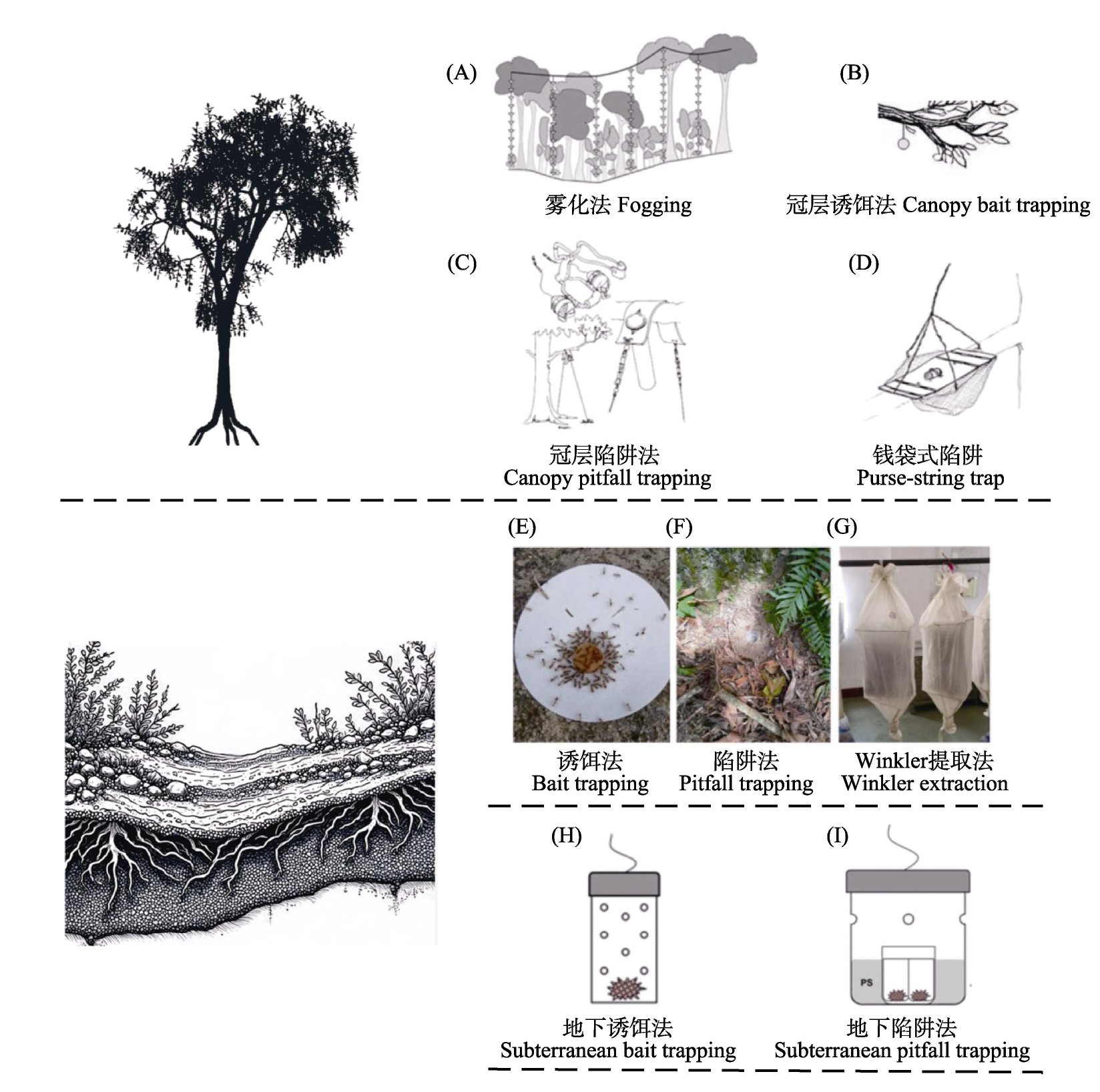 图1 垂直空间层次常见蚂蚁采样方法示意图。A: 雾化法, 引自Dial等(2006); B: 冠层诱饵法; C: 冠层陷阱法, 引自Kaspari (2000); D: 钱袋式陷阱, 引自Yusah等(2012); E: 诱饵法; F: 陷阱法; G: Winkler提取法; H: 地下诱饵法; I: 地下陷阱法, 引自Wong和Guénard (2017)。