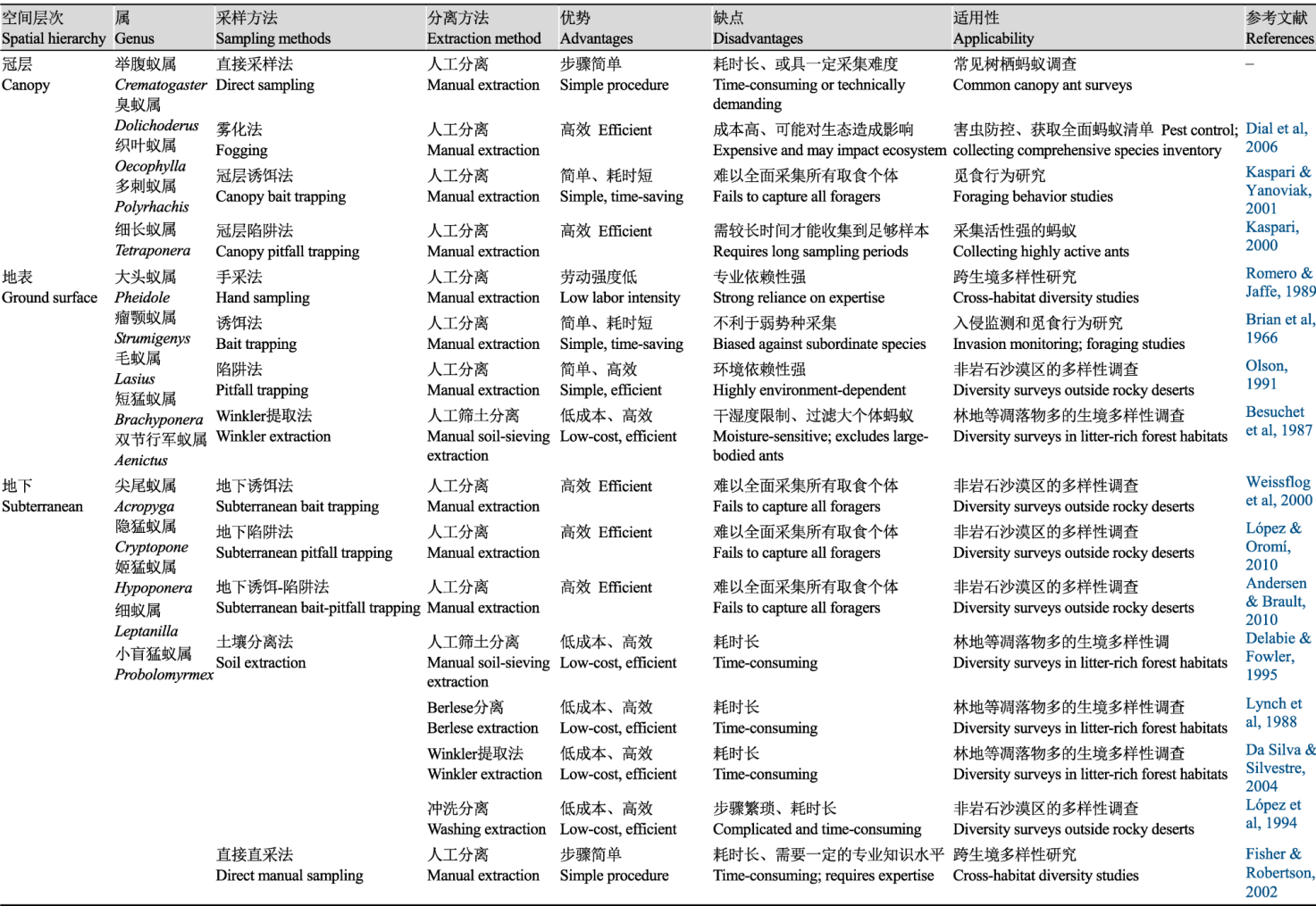 采样工作是开展生物多样性调查的基础, 近数十年来, 针对蚂蚁及其群落的研究需求呈指数级增长。尽管针对特定生境的采样方法比较已经较为丰富, 但垂直空间层次蚂蚁采样方法的系统性研究仍然有限。本文通过整理国内外公开发表的用于蚂蚁群落调查的文献, 总结和评述了冠层、落叶地表层以及地下土壤层常用蚂蚁采样方法的适用性、局限性及其互补关系, 提出针对特定的生境类型、研究目的和蚂蚁种类, 将多种采样方法组合使用, 并建议尽可能进行标准化的采样。主要建议包括: (1)针对冠层蚂蚁, 建议优先使用诱饵陷阱法, 但如果研究目的为全面且详尽地调查冠层蚂蚁种类, 可将诱饵陷阱法、钱袋式陷阱法和雾化法三者组合使用; (2)对于地表蚂蚁, 可遵循凋落物蚂蚁调查草案(Ants of the Leaf Litter Protocol)进行全面采样, 但可根据研究目的进行适度调整; (3)对于地下蚂蚁, 尽管目前仍未有各采样方法的效率比较, 但可使用地下诱饵陷阱法以及直接采样法等多种采样方法组合开展重复采样。本文为生态学相关科研工作者未来进行更深入的蚂蚁多样性调查提供了方法层次的参考, 还为多层次生态系统研究提供了系统性的采样框架, 以期促进不同研究间数据的兼容性和可比性。同时, 也为蚂蚁群落的保护和管理策略提供了科学依据, 有助于更全面地理解蚂蚁在不同垂直空间层次中的生态角色及其多样性格局。