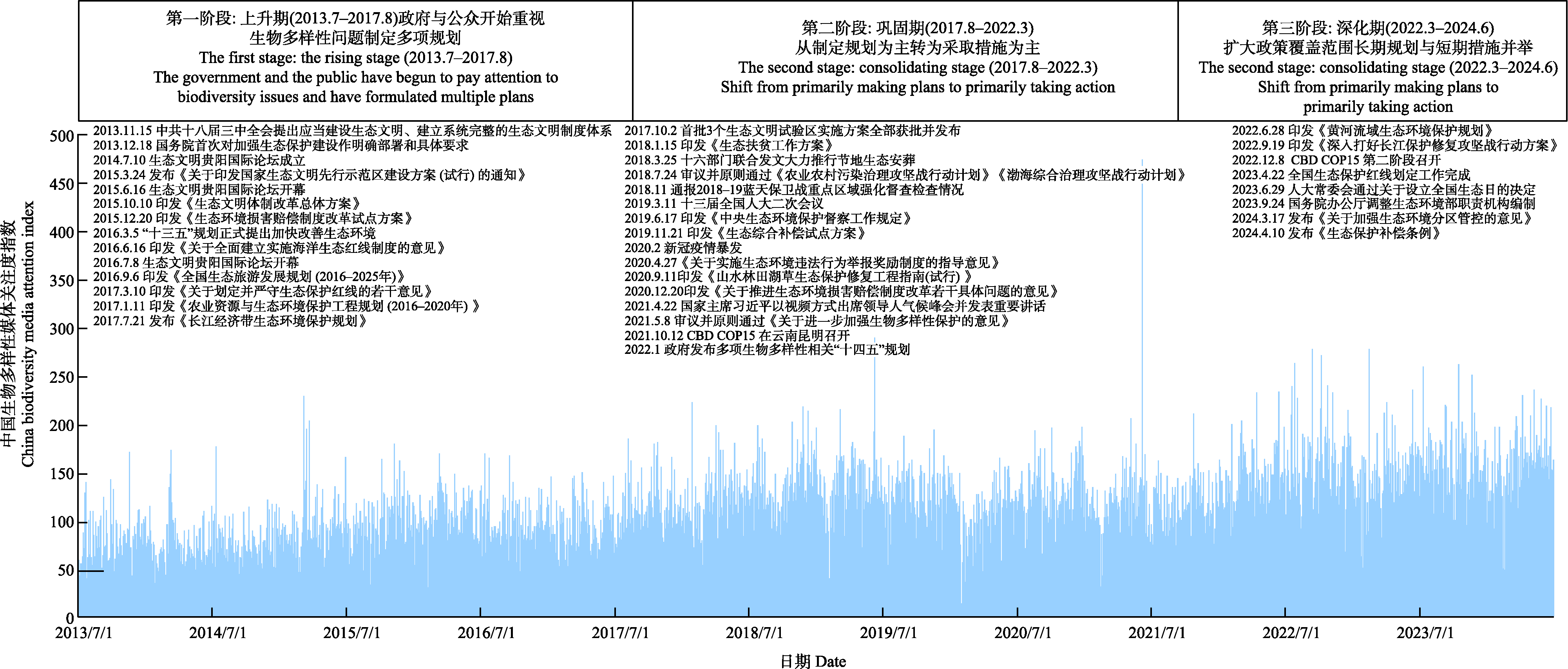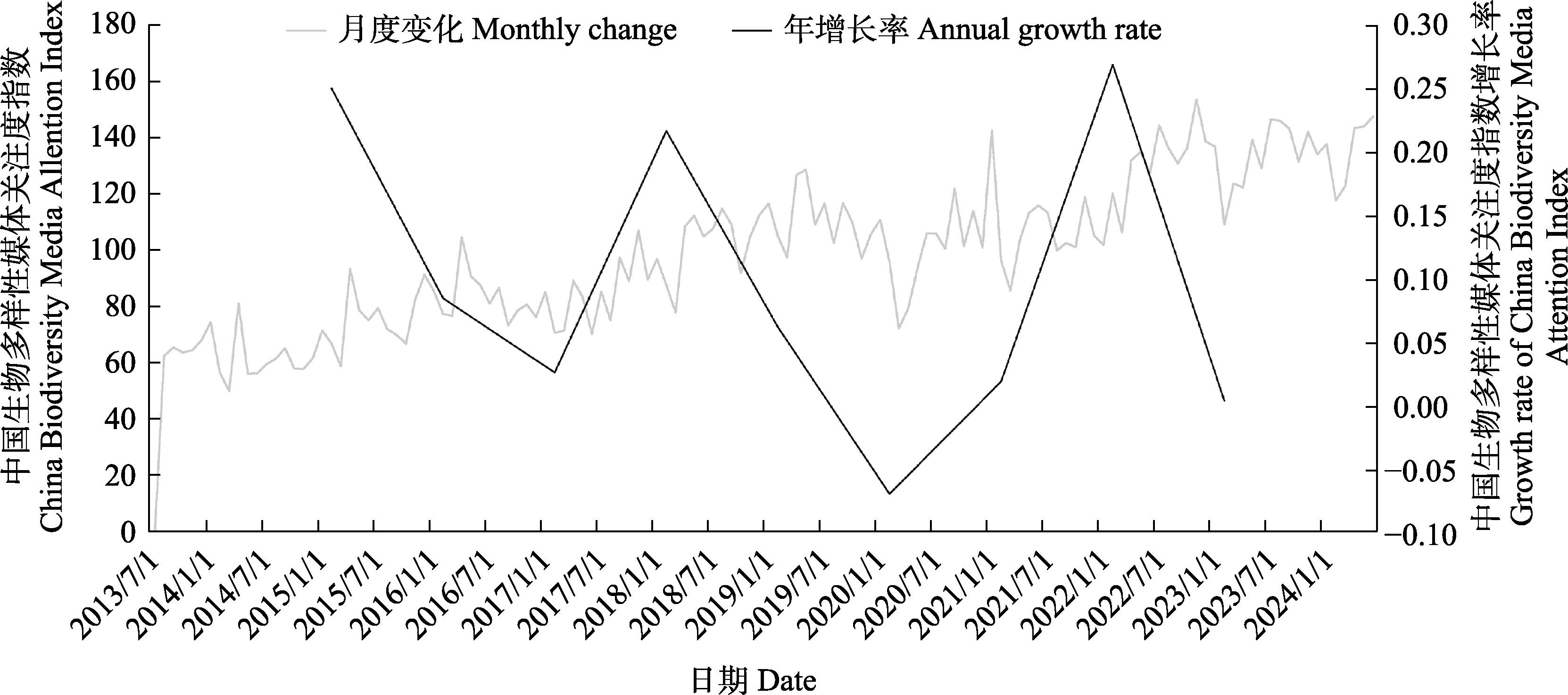 随着生物多样性保护日益受到社会关注, 探讨构建生物多样性媒体关注度指数, 对于科学评估生物多样性保护现状、激发公众参与热情、优化资源配置以及推动全球生物多样性保护目标的实现具有重要意义。本研究利用文本挖掘技术, 系统性地筛选关键词, 并基于2013-2024年3家权威新闻媒体的报道, 构建了首个中国生物多样性媒体关注度指数(China Biodiversity Media Attention Index), 并通过对时间区间的替换及与国际指数的比较, 验证了其稳健性和有效性。研究发现: (1)生物多样性媒体关注度指数与中国生物多样性保护政策和重大事件密切相关, 可以有效反映政府和社会关注度的变化; (2)中国生物多样性媒体关注度发展划分为上升期、巩固期和深化期3个阶段。其中, 上升期以政策筹备和规划为主; 巩固期开始加快政策实施步伐, 政策内容逐步从规划制定转向具体执行; 深化期政策频率显著提高, 涵盖范围更加广泛。中国生物多样性媒体关注度指数可以为政策制定、政府监管、企业风险管理、科学研究和投资决策提供重要参考。