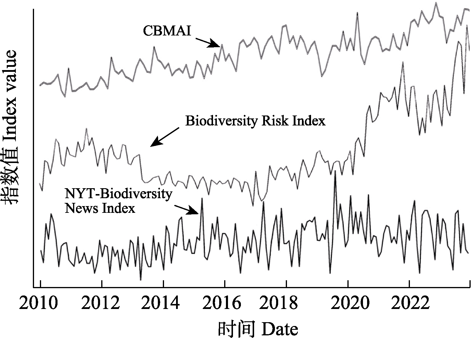 图4 中国生物多样性媒体关注度指数(CBMAI)与生物多样性风险指数、纽约时报生物多样性新闻指数的对比