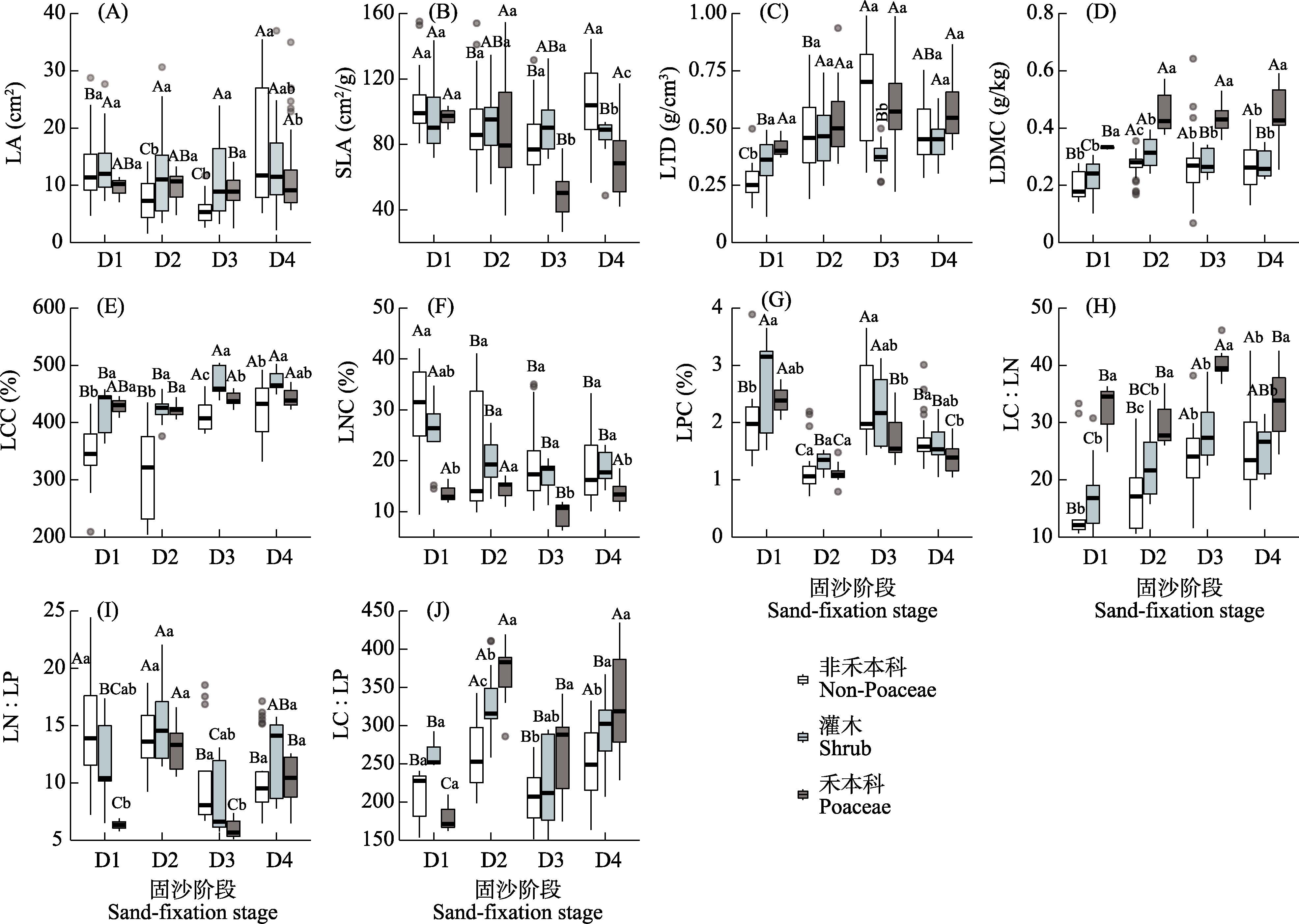 图1 不同固沙阶段各植物功能群叶性状差异。LA: 叶面积; SLA: 比叶面积; LTD: 叶组织密度; LDMC: 叶干物质含量; LCC: 叶片碳含量; LNC: 叶片氮含量; LPC: 叶片磷含量; LC : LN: 叶片碳氮比; LN : LP: 叶片氮磷比; LC : LP: 叶片碳磷比; D1: 半固定沙地; D2: 固定沙地; D3: 土壤结皮固定沙地; D4: 草本植物固定沙地。不同大写字母表示不同固沙阶段间差异显著, 不同小写字母表示不同功能群间差异显著(P < 0.05)。