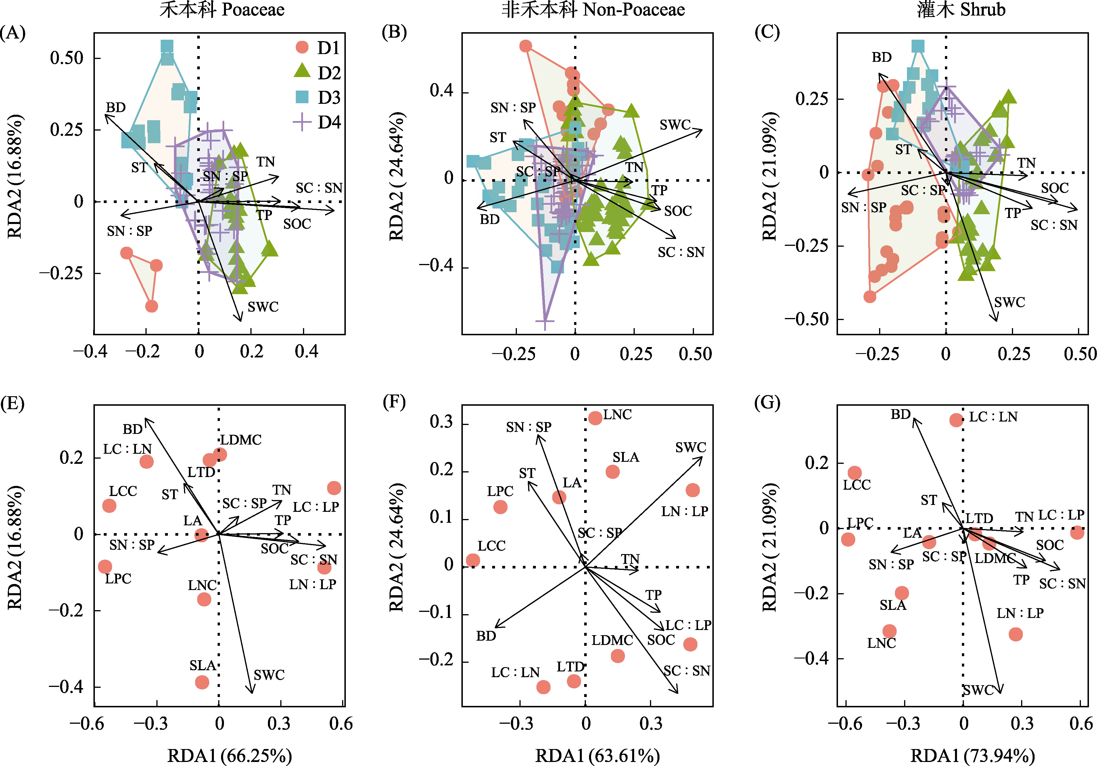 图2 不同固沙阶段不同植物功能群叶性状集合分布(A-C)及叶性状(E-G)与土壤环境因子的冗余分析。BD: 土壤容重; SOC: 土壤有机碳含量; TN: 土壤全氮含量; TP: 土壤全磷含量; SC : SN: 土壤碳氮比; SN : SP: 土壤氮磷比; SC : SP: 土壤碳磷比; SWC: 土壤含水量; ST: 土壤温度; LA: 叶面积; SLA: 比叶面积; LTD: 叶组织密度; LDMC: 叶干物质含量; LCC: 叶片碳含量; LNC: 叶片氮含量; LPC: 叶片磷含量; LC : LN: 叶片碳氮比; LN : LP: 叶片氮磷比; LC : LP: 叶片碳磷比; D1: 半固定沙地; D2: 固定沙地; D3: 土壤结皮固定沙地; D4: 草本植物固定沙地。箭头代表土壤环境因子, 圆圈代表植物叶性状。