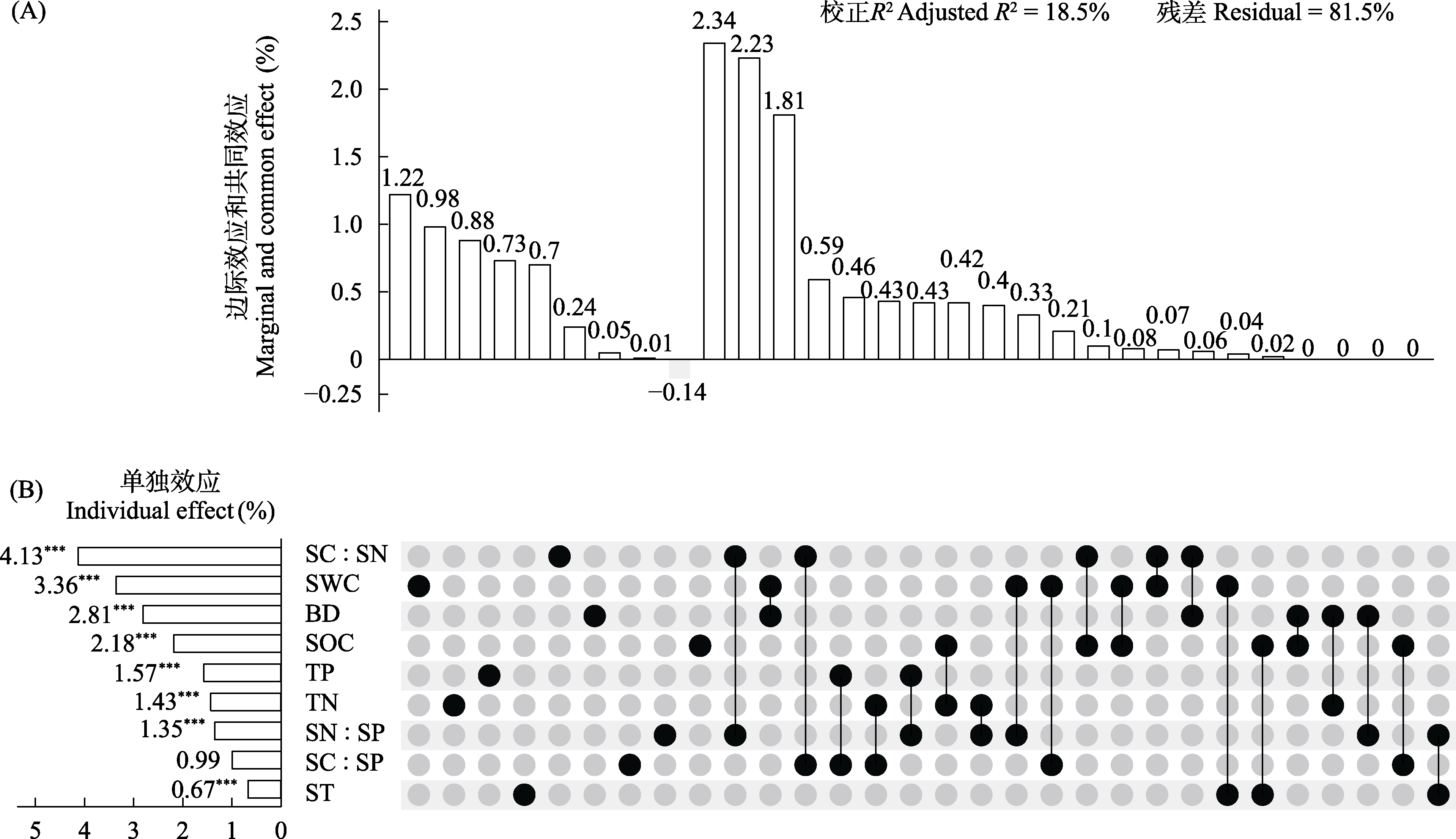 Fig. 3 UpSet matrix layout of variation partitioning and hierarchical partitioning analysis results to show the relative importance of soil environmental factors on variation of plant traits. (A) Percentage of variation explained by each component (individual effects and common effects of environmental factors). (B) In the dot-matrix plot on the right, each row corresponds to an environmental factor. For each column, the isolated black dot represents the marginal effect of each environmental factor, lines connecting multiple dots represent the common effect among these corresponding environmental factors. Column diagram on the left shows individual effect of each environmental factor (from hierarchical partitioning), its value is equal to its marginal effect plus its average shared common effect with other environmental factors. BD, Soil bulk density; SOC, Soil organic carbon content; TN, Soil total nitrogen content; TP, Soil total phosphorus content; SC : SN, Soil carbon to nitrogen ratio; SN : SP, Soil nitrogen to phosphorus ratio; SC : SP, Soil carbon to phosphorus ratio; SWC, Soil water content; ST, Soil temperature. ***, P < 0.001.