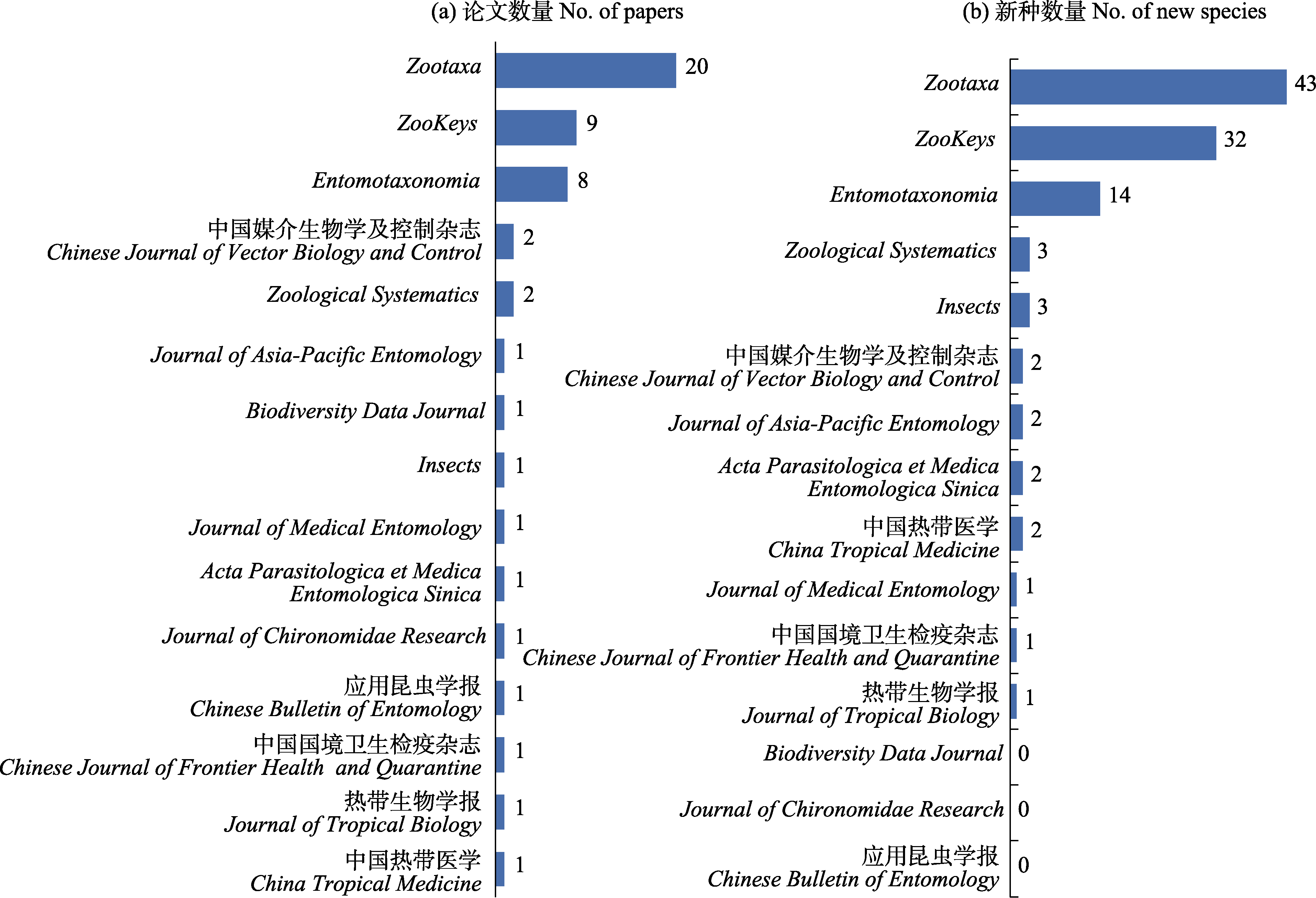 图3 2024年发表中国双翅目昆虫新分类单元的期刊发表的论文数量(a)和新种数量(b)