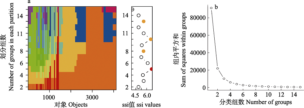 图1 最优分类组数判断指标。(a)不同分类情况下的各对象归属和各分类组数对应的ssi (simple structure index)值, 其中左边的图表示每个对象在不同分类情况下的归属, 一种颜色代表一个分类组; 右图展示了不同分类组数对应的ssi值大小。(b)不同分类组数时分成的各类的组内平方和。